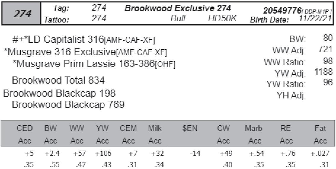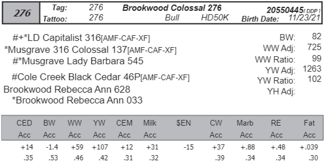 34 BROOKWOOD COLOSSAL 276 20550445 DDP HD50K Birth Date: 11/23/21 NOTES: Gain Ratio: 92