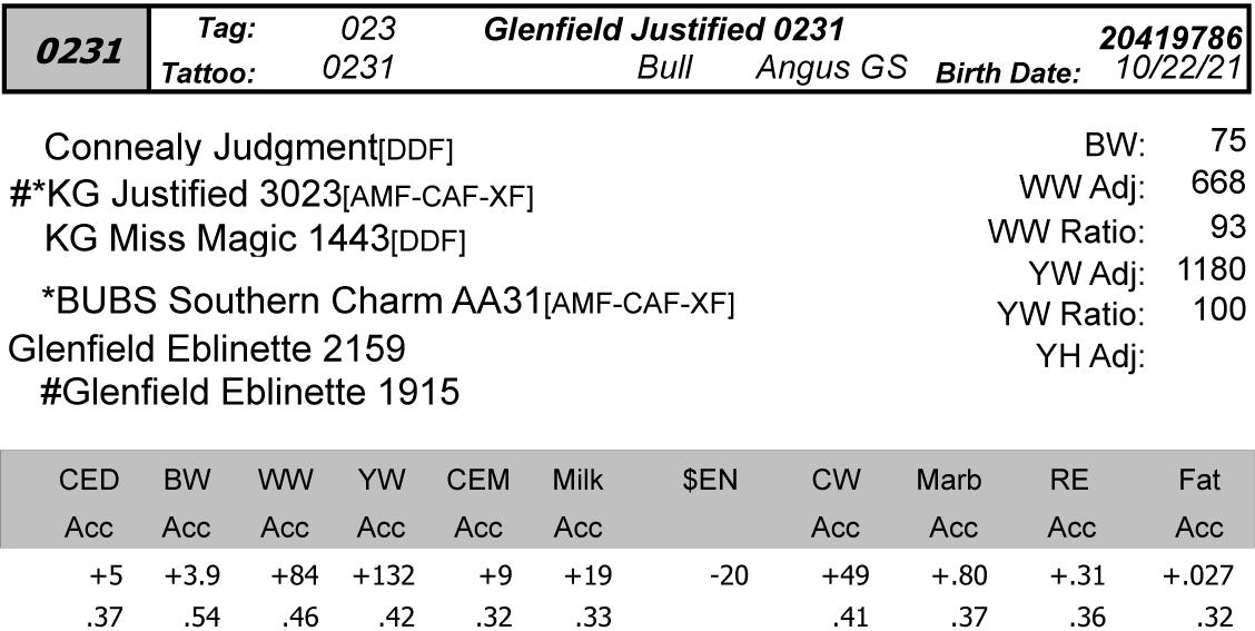 42 GLENFIELD JUSTIFIED 0231 20419786 ANGUS GS Birth Date: 10/22/21