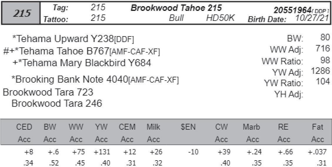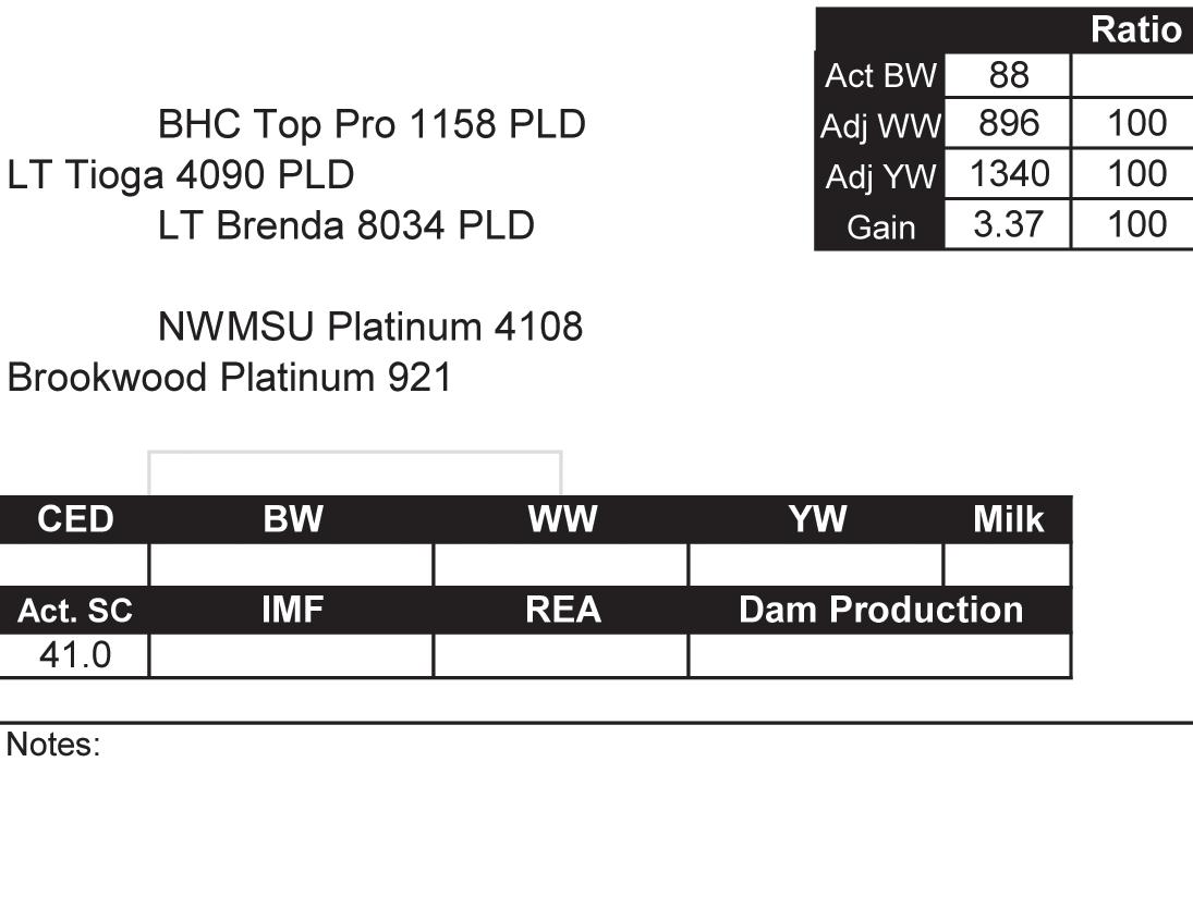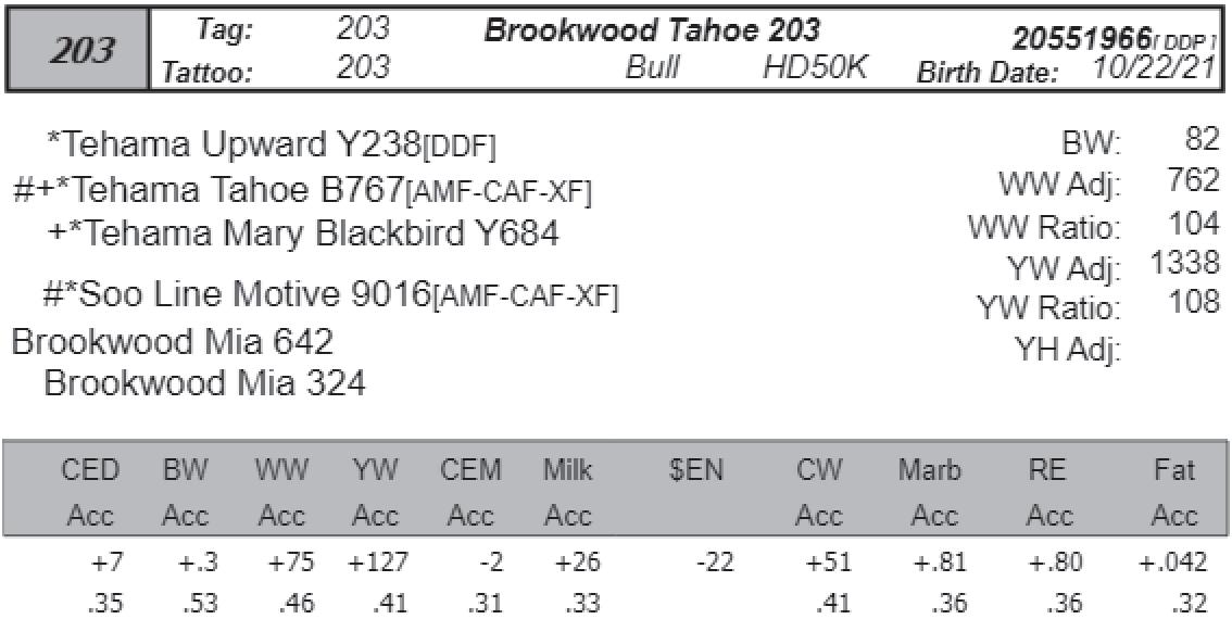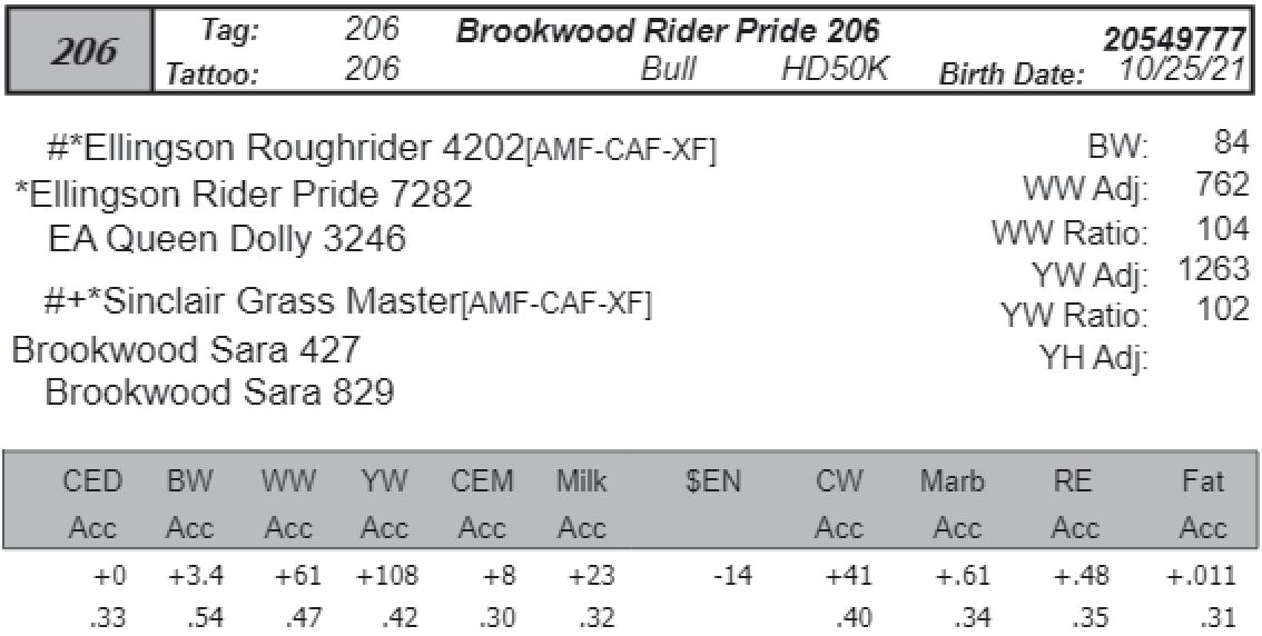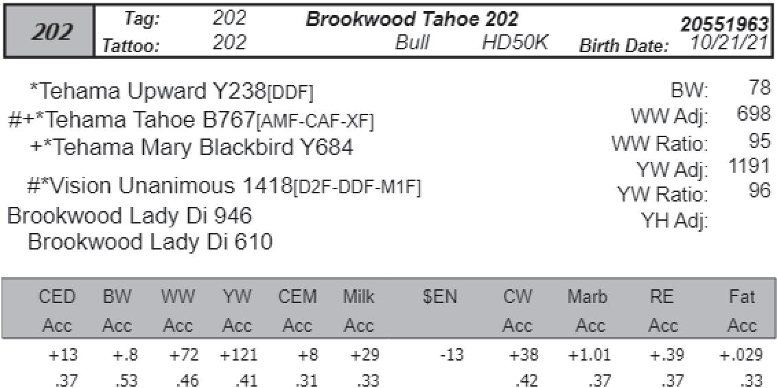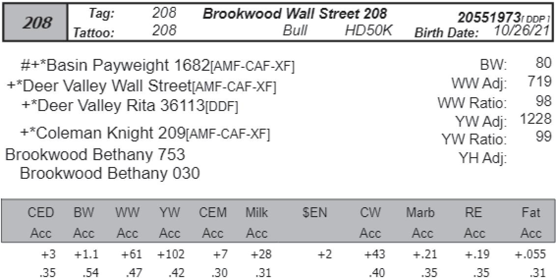 2 BROOKWOOD TAHOE 202 20551963 HD50K Birth Date: 10/21/21 Lot 5 BROOKWOOD RIDER PRIDE 206 20549777 HD50K Birth Date: 10/25/21 Lot 3 BROOKWOOD TAHOE 203 20551966 DDP HD50K Birth Date: 10/22/21 NOTES: Gain Ratio: 103 Lot 4 BROOKWOOD WALL STREET 205 20551972 DDP HD50K Birth Date: 10/24/21 NOTES: Lot 6 BROOKWOOD WALL STREET 208 20551973 DDP HD50K Birth Date: 10/26/21 NOTES: Gain Ratio: 103 Gain Ratio: 99