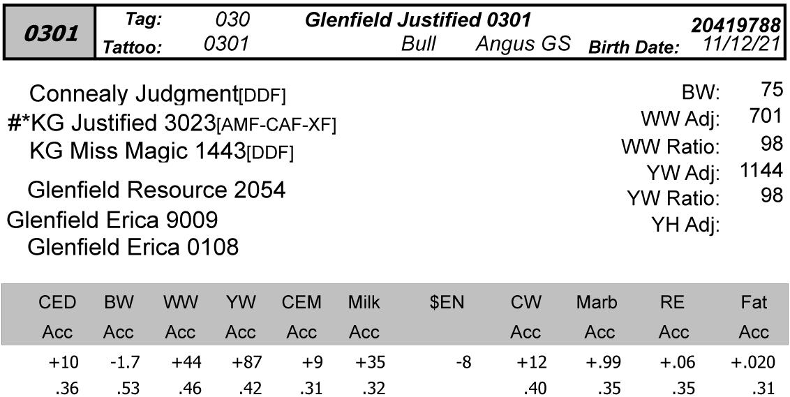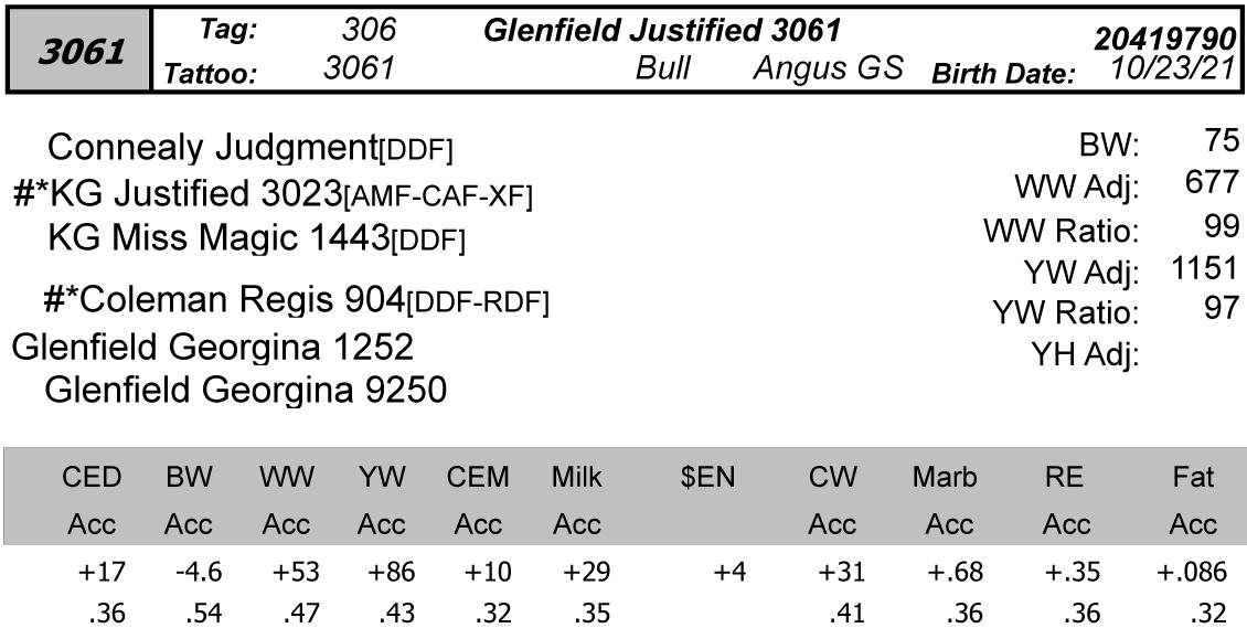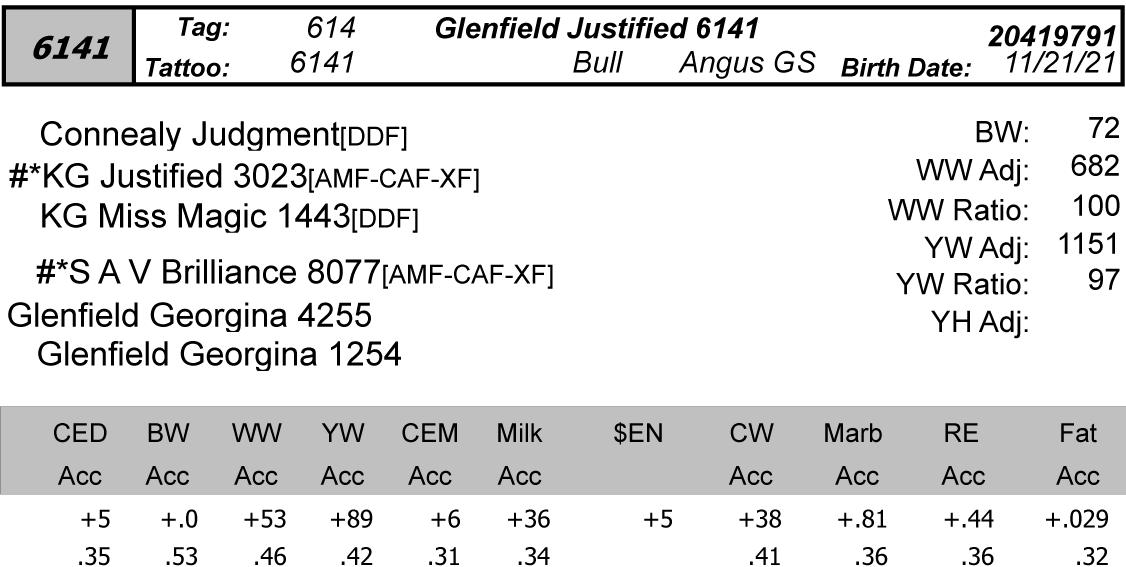 GLENFIELD JUSTIFIED 6141 20419791 ANGUS GS Birth Date: 11/21/21 NOTES: