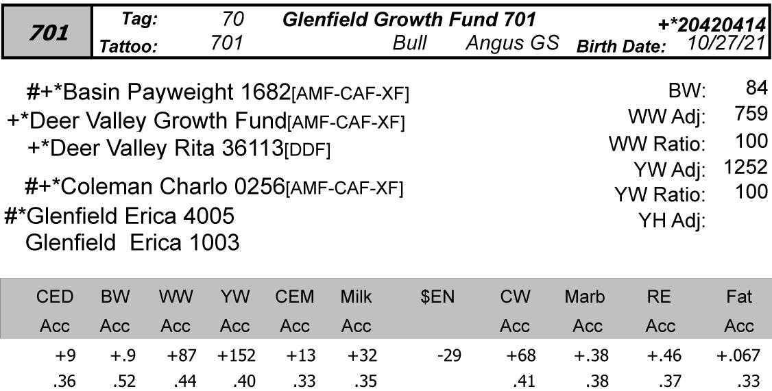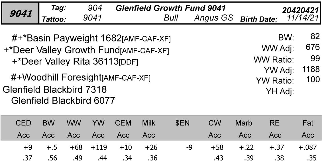 60 GLENFIELD GROWTH FUND 9041 20420421 ANGUS GS Birth Date: 11/14/21 NOTES: Gain Ratio: 98