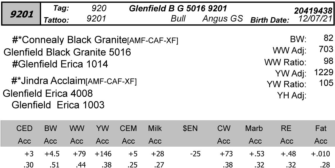 GLENFIELD B G 5016 9201 20419438 ANGUS GS Birth Date: 12/07/21 NOTES: Gain Ratio: 94 Gain Ratio: 120 NOTES: Gain Ratio: 96