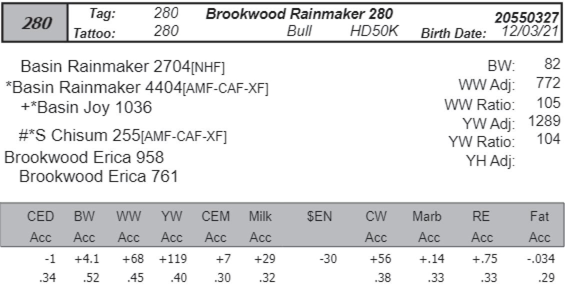 36 BROOKWOOD RAINMAKER 280 20550327 HD50K Birth Date: 12/03/21 NOTES: Gain Ratio: 101 Lot 36