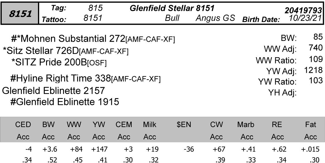 46 GLENFIELD STELLAR 8151 20419793 ANGUS GS Birth Date: 10/23/21