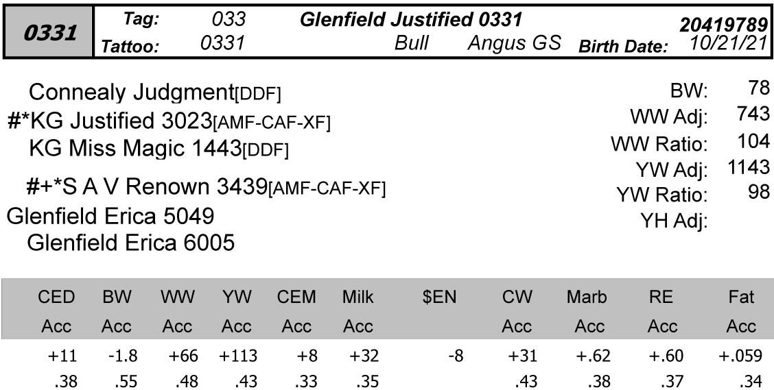 41 GLENFIELD JUSTIFIED 0331 20419789 ANGUS GS Birth Date: 10/21/21