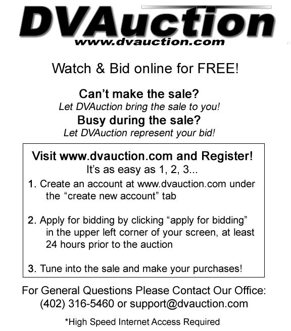 If you will not be able to attend the sale but would like to place a bid, feel free to participate via conference call or leave a bid with the auctioneer, David Seymour or Austin Johnson prior to the sale. Internet bidding is available via www.DVAuction.com.