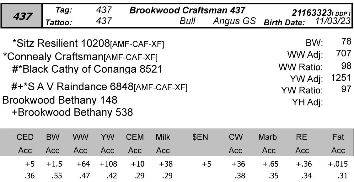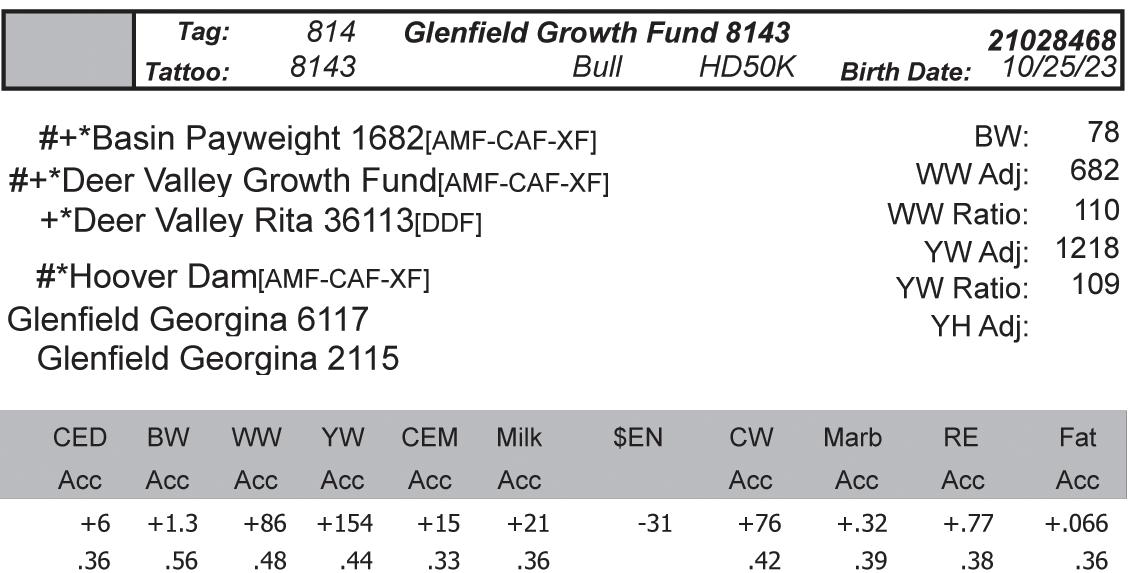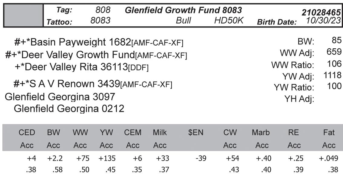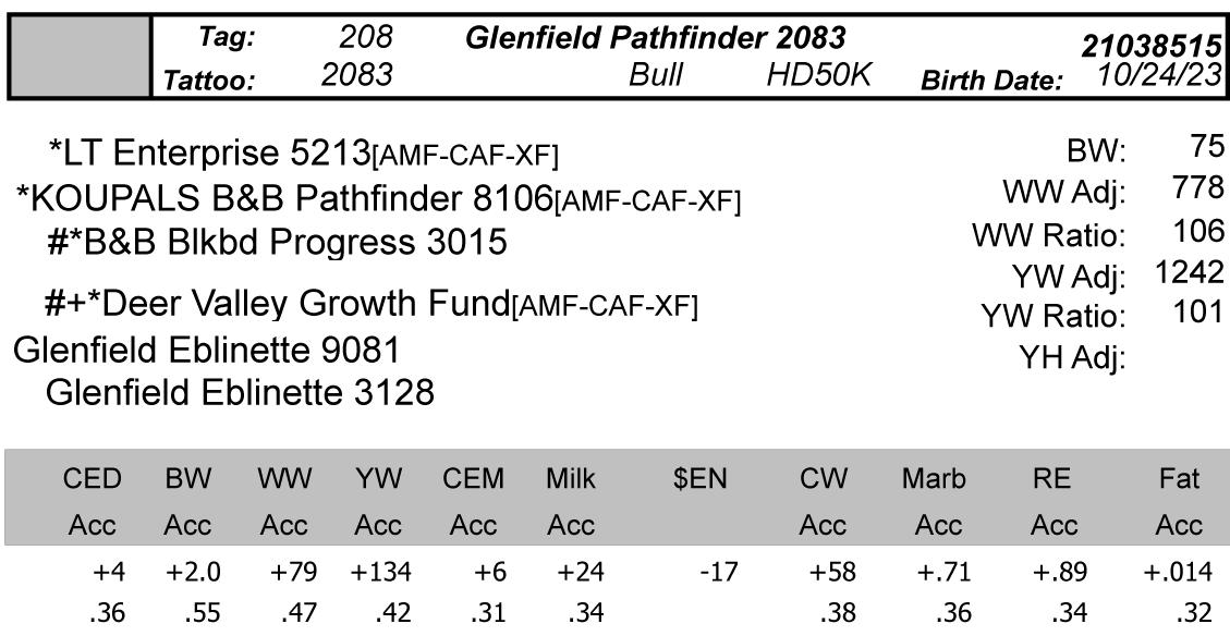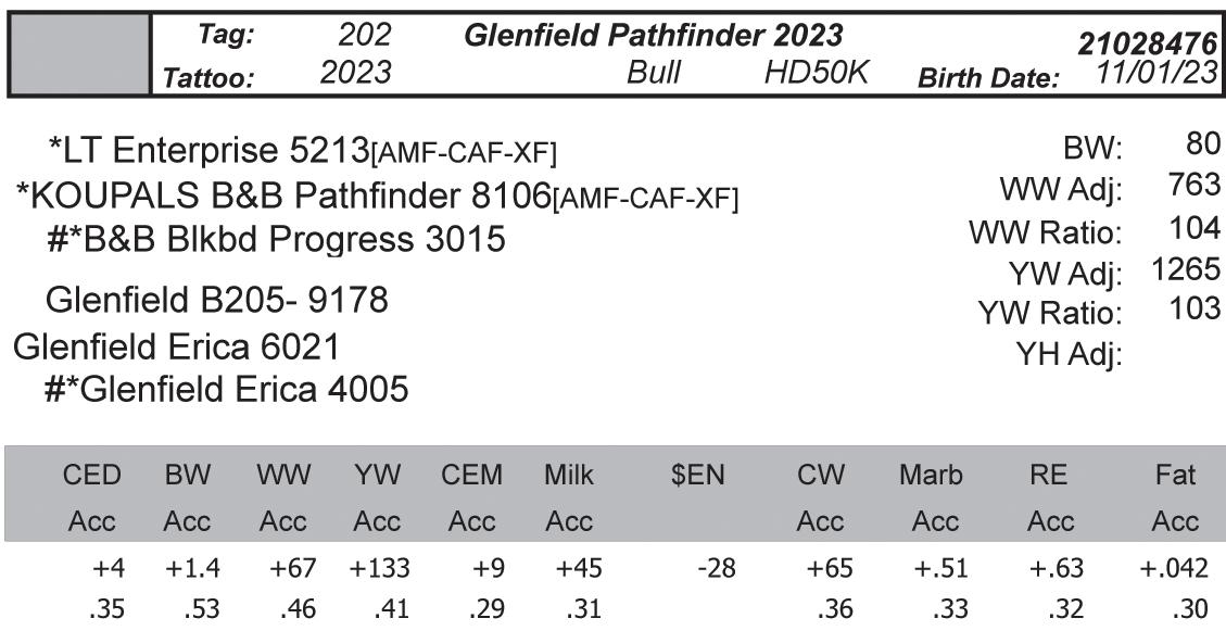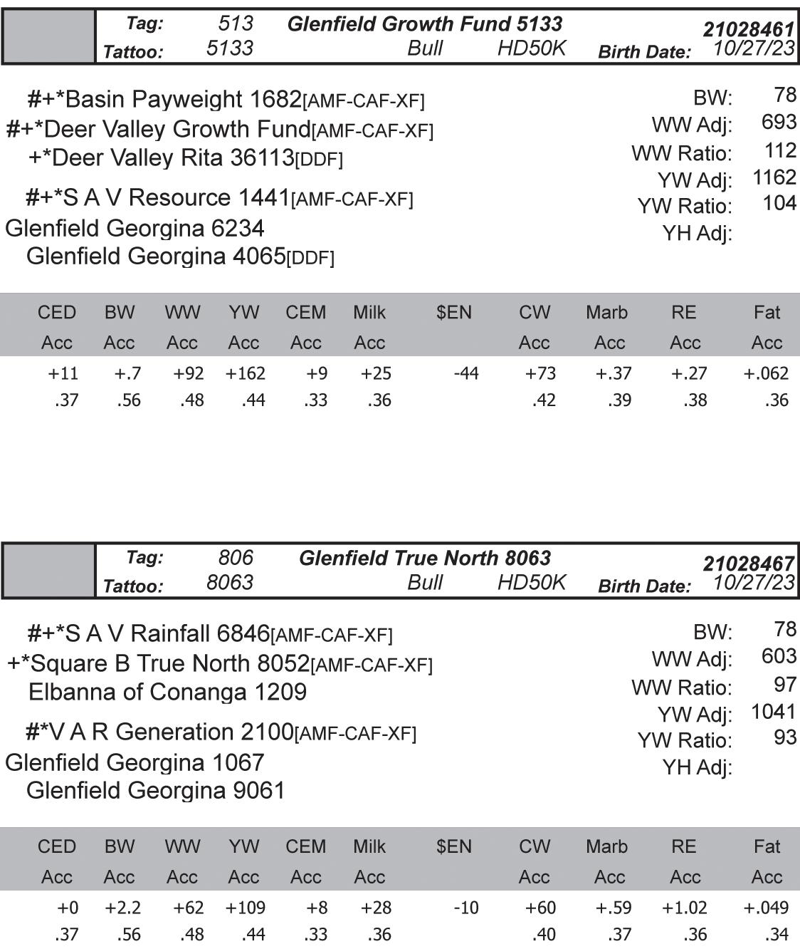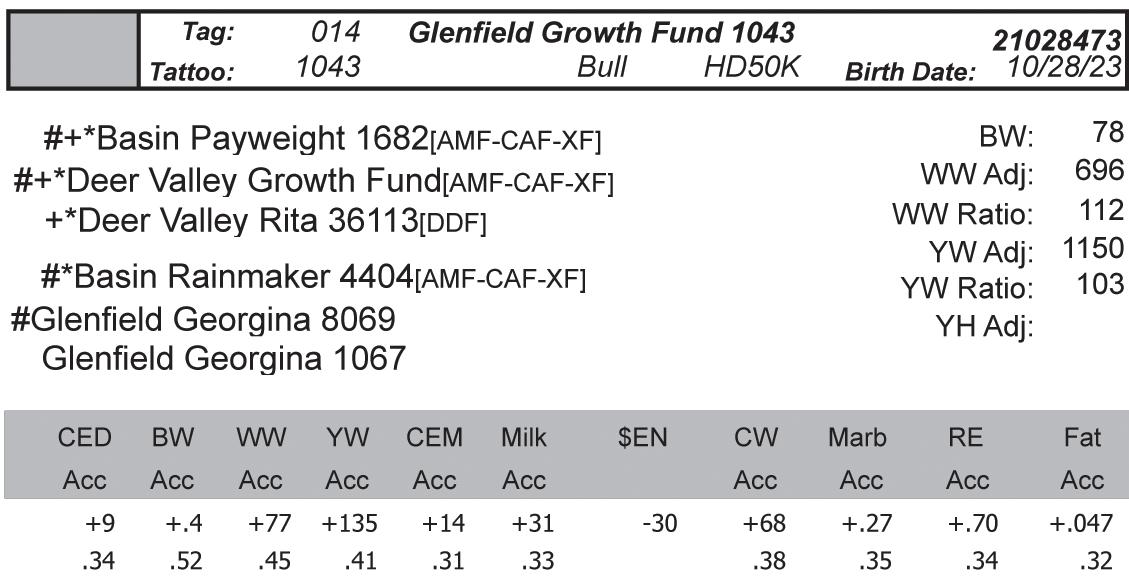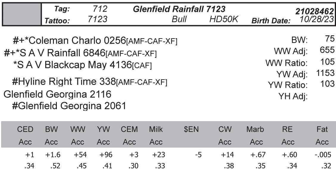 Certificates of registry on all purebred bulls will be furnished and transferred by the seller to the buyer at the seller’s expense. EPDs are accurate at time of catalog printing but are subject to change as additional data becomes available.