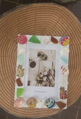 Create a 4x6 beach themed picture frame using seashells and sea glass.
