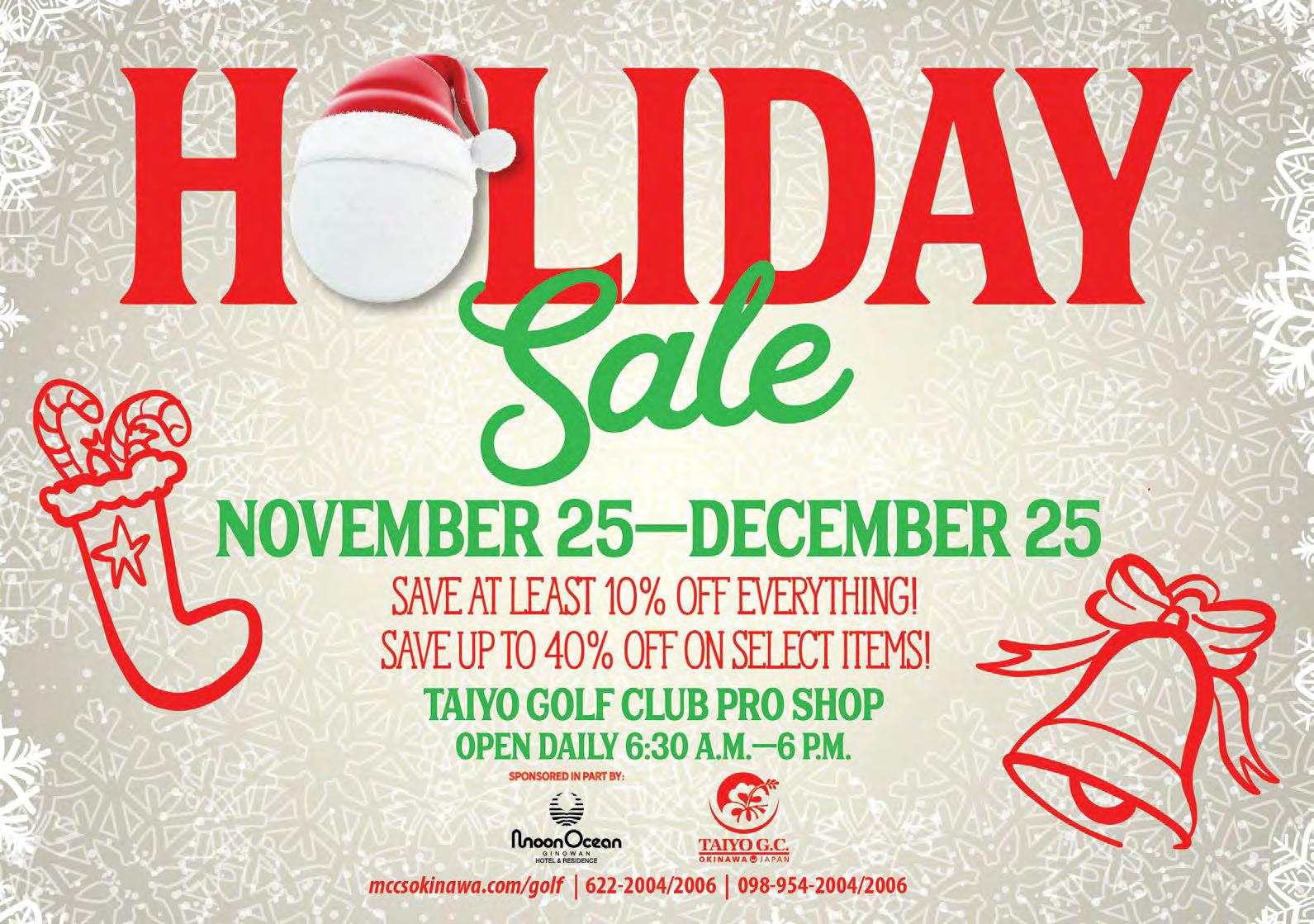 Looking for a present for a golfer or someone who is thinking of taking up the game? How about picking up a new driver, putter, golf bag or golf accessory from the Taiyo Golf Club Pro Shop? Everything in the store will be on sale from November 25 until December 25 (for the ultimate shopping procrastinator). Storewide, discounts begin at 10% with selected items up to 40% off! For more information on the Taiyo Golf Club Holiday Sale, call 622-2004.
