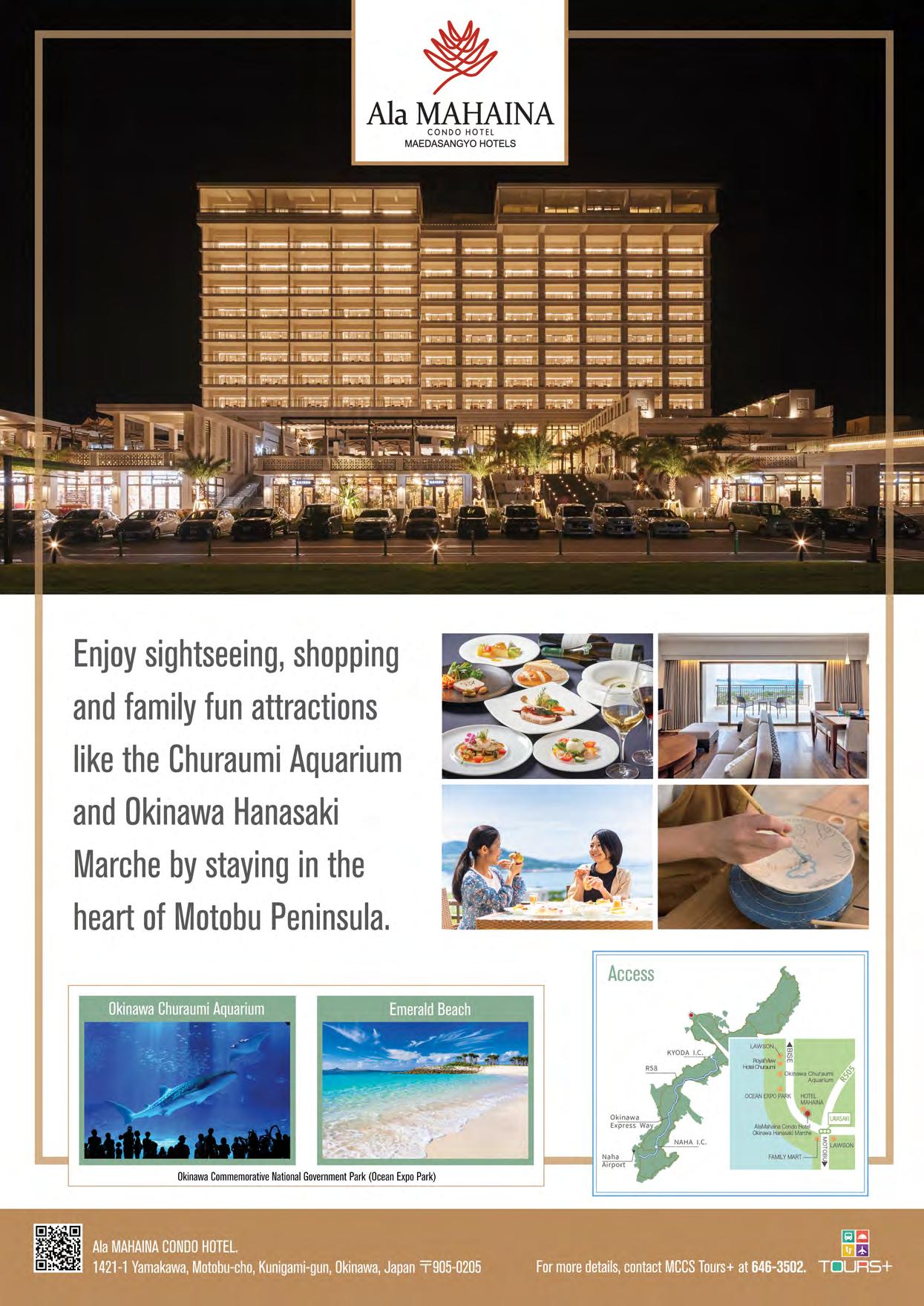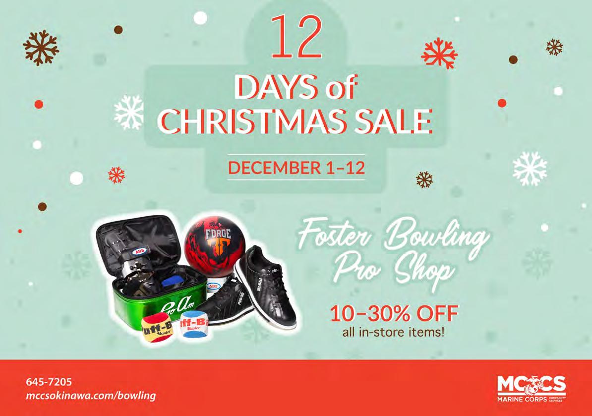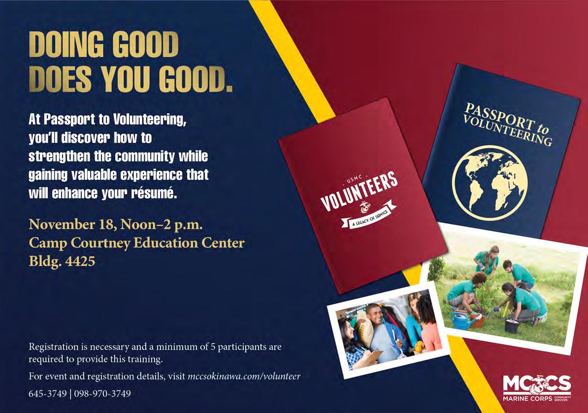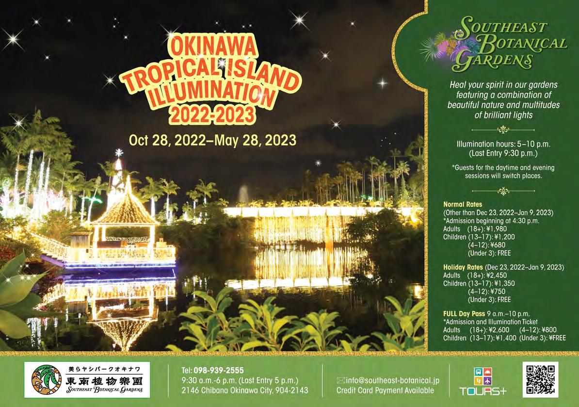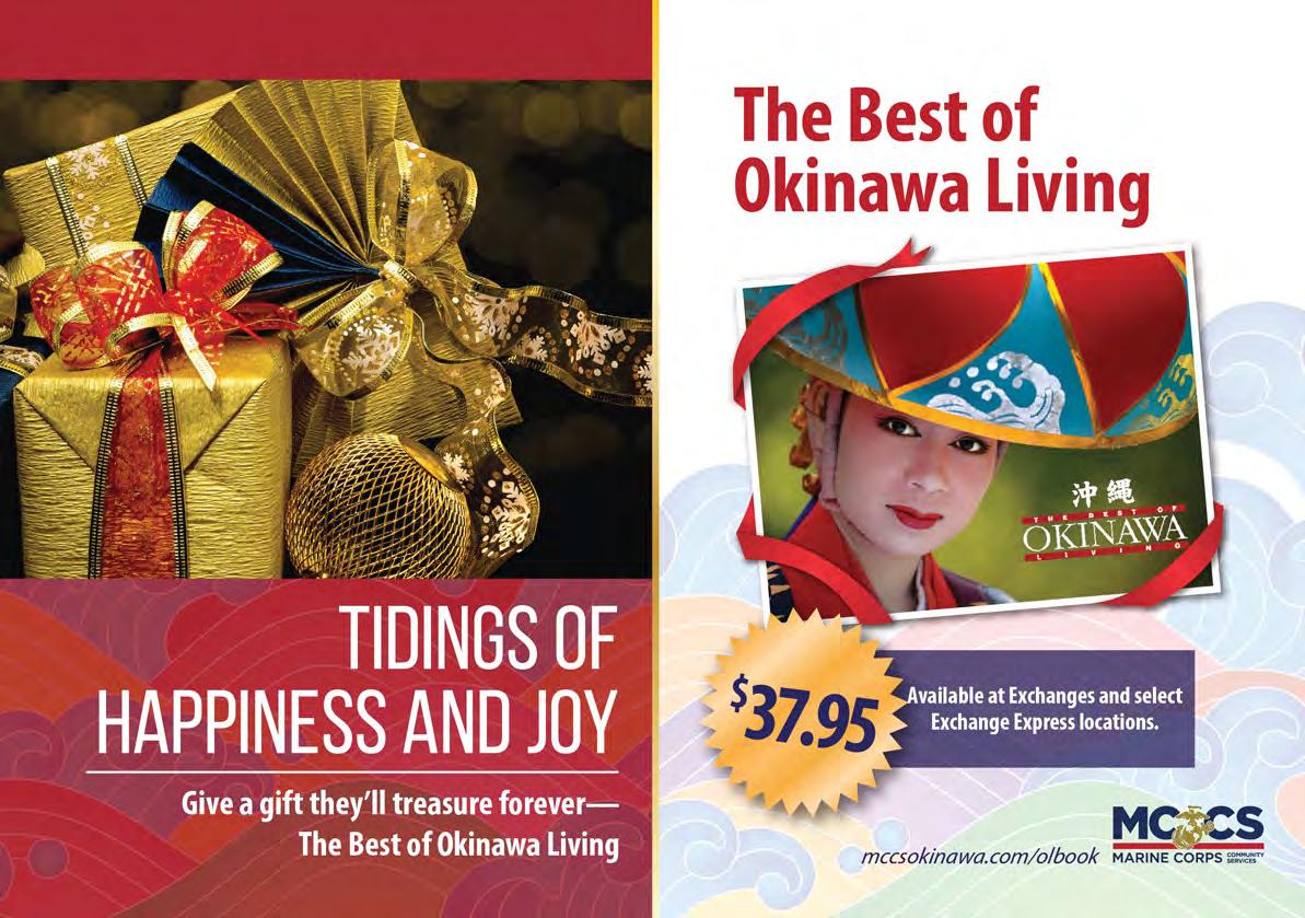 We welcome your comments. Please send letters to editor@okinawa.usmc-mccs.org For advertising | 広告掲載のお問い合わせ (日本語可) 098-970-2245 (phone) | 098-970-0975 (fax) sales@okinawa.usmc-mccs.org (email) See our advertising rates at mccsokinawa.com MCCS MARKETING BRANCH MCB Camp S.D. Butler. Unit 35023, FPO AP 96378-5023 Okinawa Living is published by MCCS Marketing. Its purpose is to inform the military and civilian community about events and programs offered by MCCS or available in the local market. Dates and times may change. Copyright ©2022 by MCCS. All rights reserved. No part of this publication may be reproduced, stored in a retrieval system, or transferred in any form, by any means, electronic, photocopying, recording, or otherwise without written permission of the copyright owner. No federal or Marine Corps endorsement of advertisers and sponsors. MCCS is not responsible for editing content of non-MCCS ads. Okinawa Living Magazine is printed with NOVEMBER 2022 | ISSUE 297