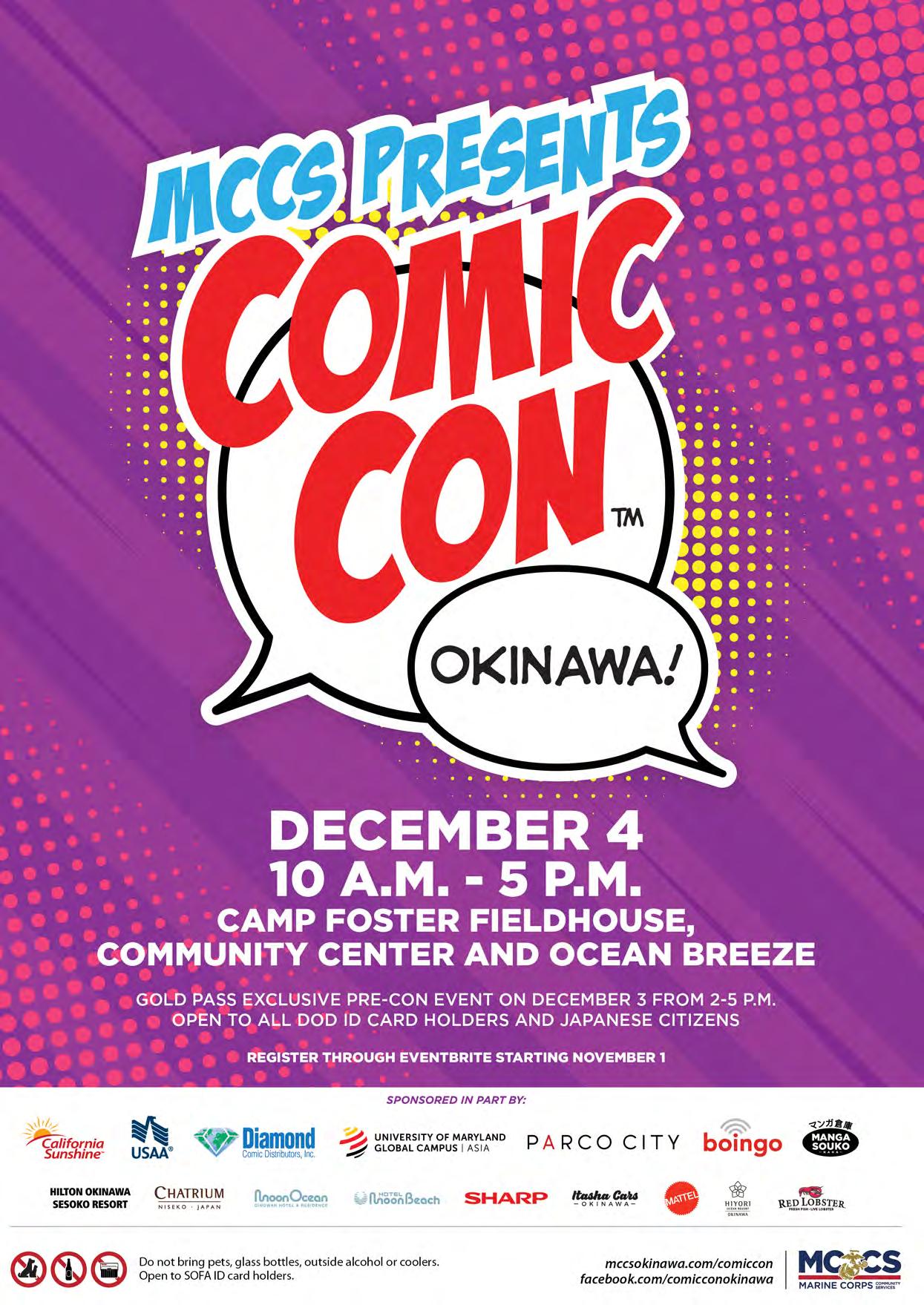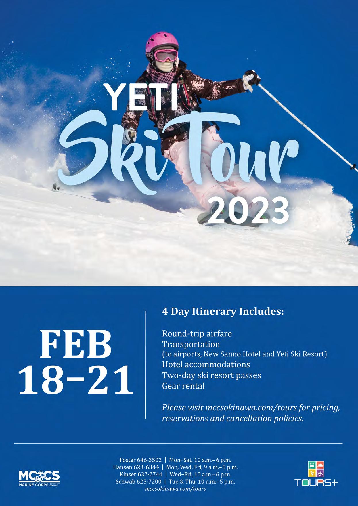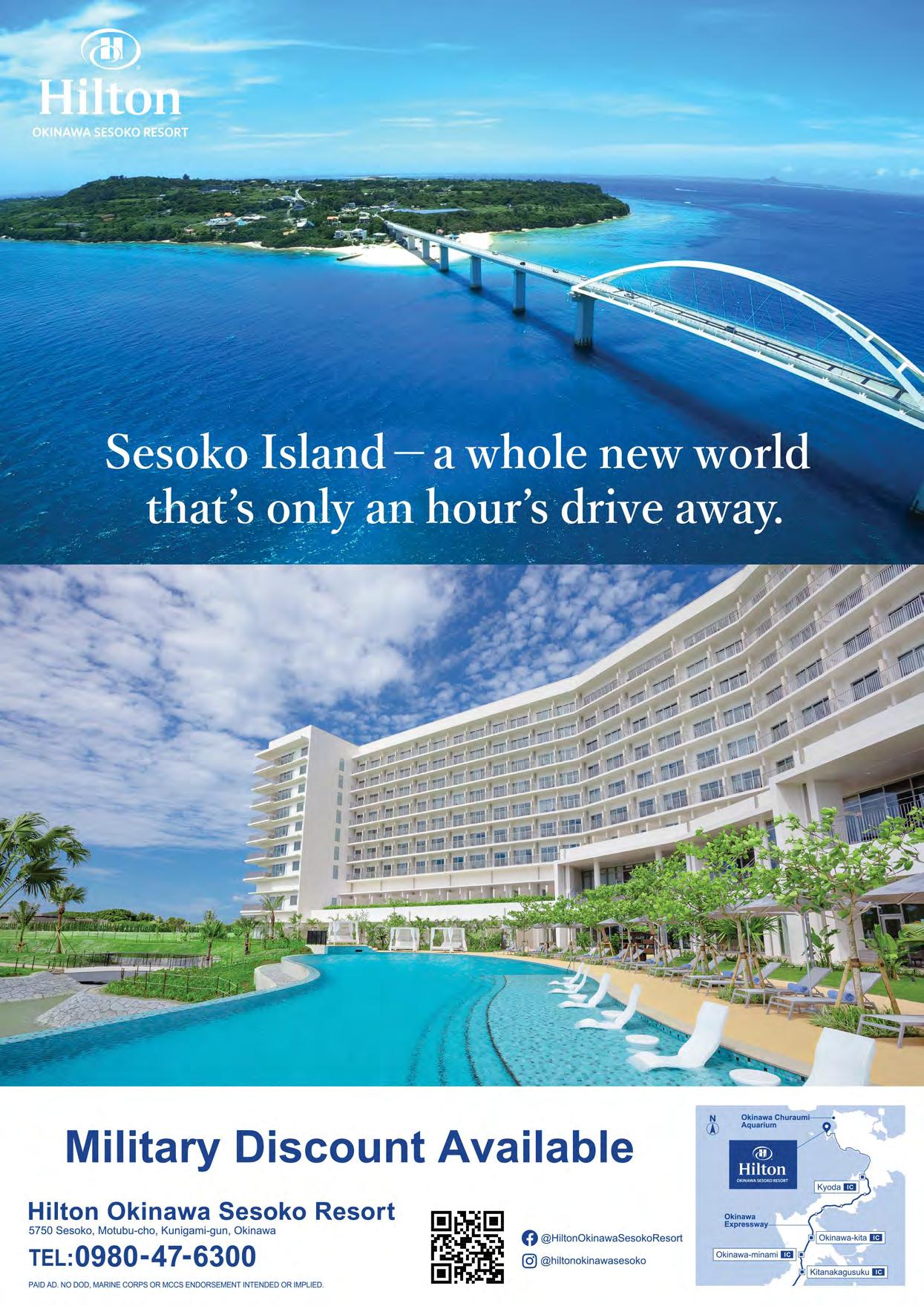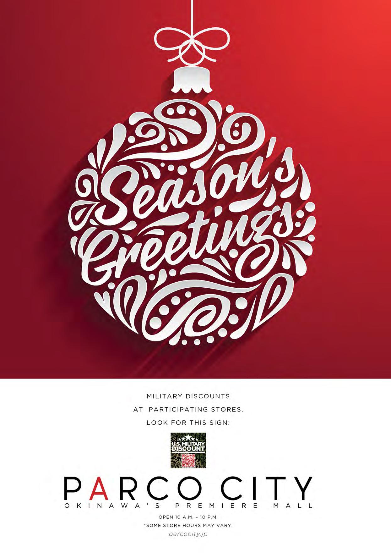 We welcome your comments. Please send letters to editor@okinawa.usmc-mccs.org For advertising | 広告掲載のお問い合わせ (日本語可) 098-970-2245 (phone) | 098-970-0975 (fax) sales@okinawa.usmc-mccs.org (email) See our advertising rates at mccsokinawa.com MCCS MARKETING BRANCH MCB Camp S.D. Butler. Unit 35023, FPO AP 96378-5023 Okinawa Living is published by MCCS Marketing. Its purpose is to inform the military and civilian community about events and programs offered by MCCS or available in the local market. Dates and times may change. Copyright ©2022 by MCCS. All rights reserved. No part of this publication may be reproduced, stored in a retrieval system, or transferred in any form, by any means, electronic, photocopying, recording, or otherwise without written permission of the copyright owner. No federal or Marine Corps endorsement of advertisers and sponsors. MCCS is not responsible for editing content of non-MCCS ads. Okinawa Living Magazine is printed with NOVEMBER 2022 | ISSUE 297