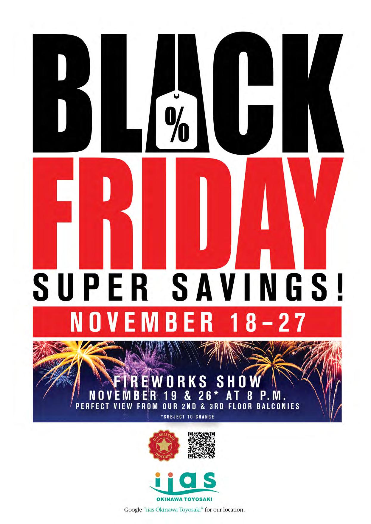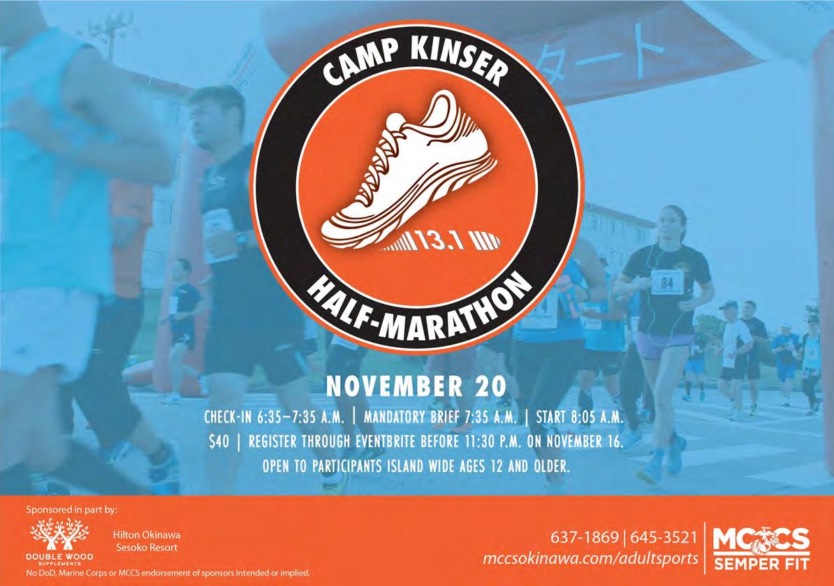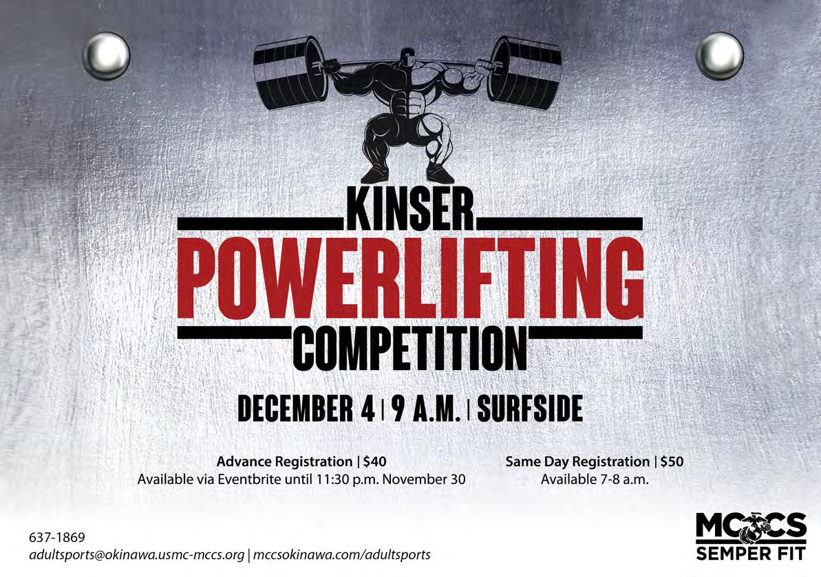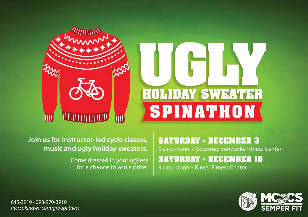 black friday Aerobathon November 25, 9:30 a.m.–12:30 p.m. Gunners Fitness Center, Camp Foster No registration required. First come, rst served. Open to all with base access; children ages 12-18 may attend with a parent or legal guardian. 645-3910 mccsokinawa.com/healthpromotion facebook.com/mccsokinawa.semper t We encourage and support the participation of individuals of all abilities. Please call MCCS Health Promotion 645-3910 or email mccshealthpromotions@okinawa.usmc-mccs.org if you need any assistance or require an accommodation.