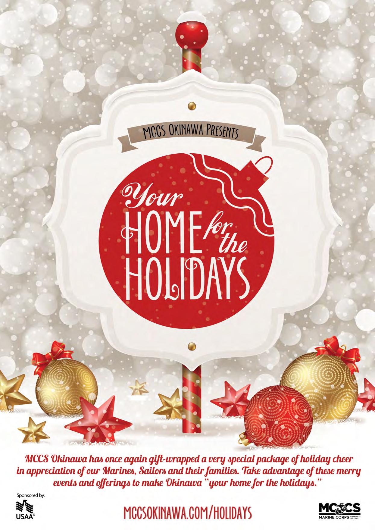 Check out mccsokinawa.com/holidays for a full listing of 2022 Your Home for the Holidays offerings taking place this year and take advantage of these FREE events, entertainment and more to make your holiday season merry and bright.