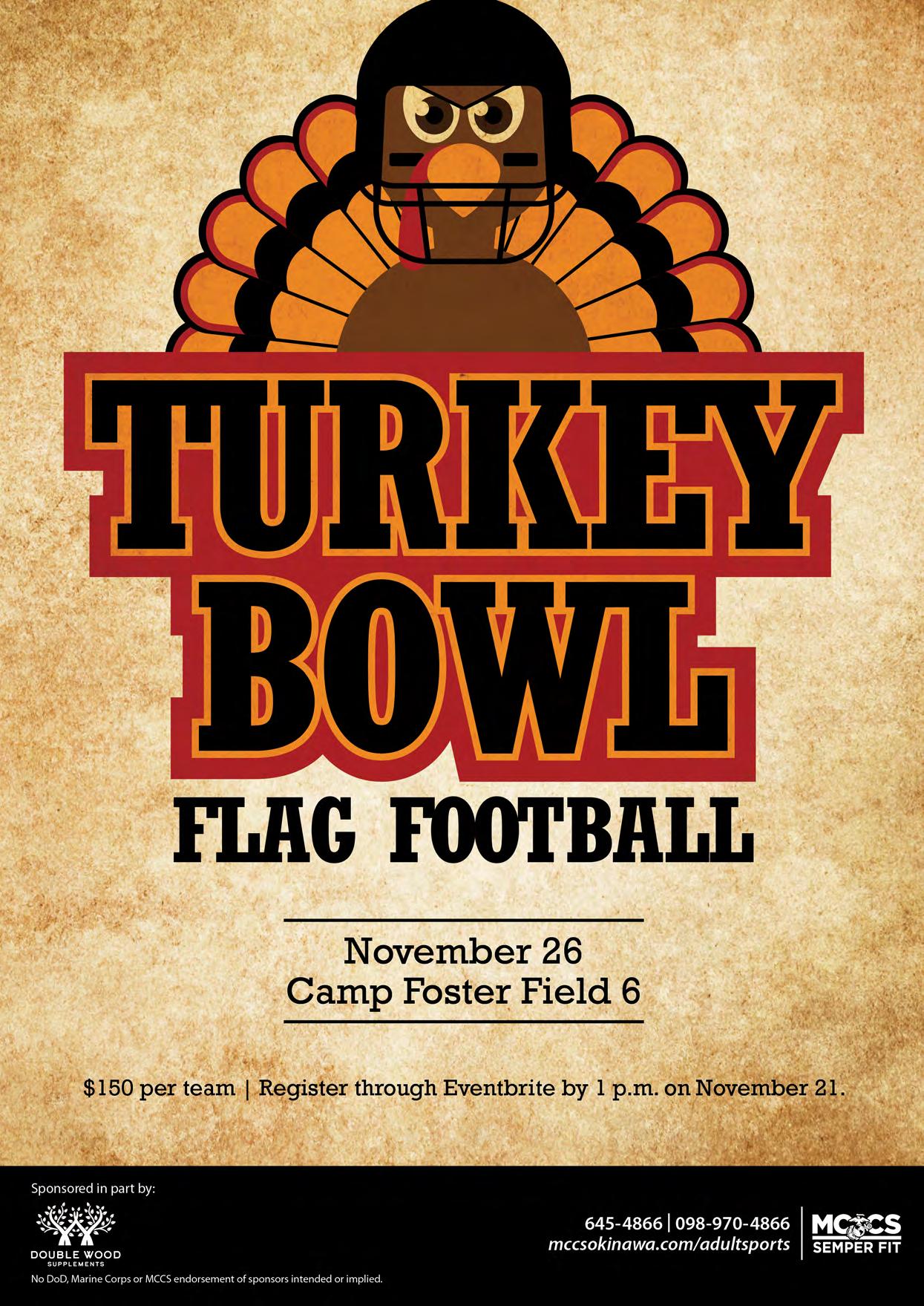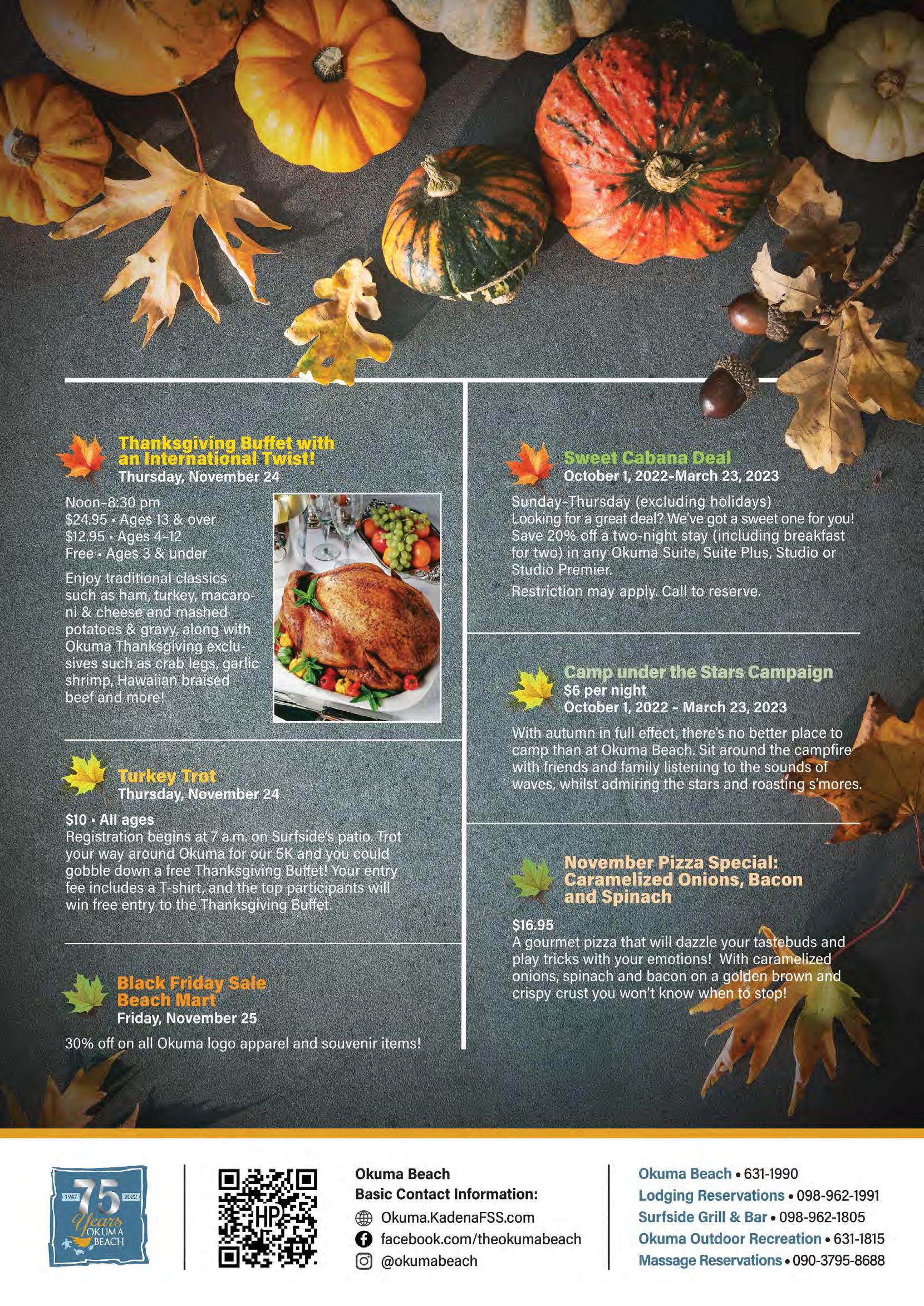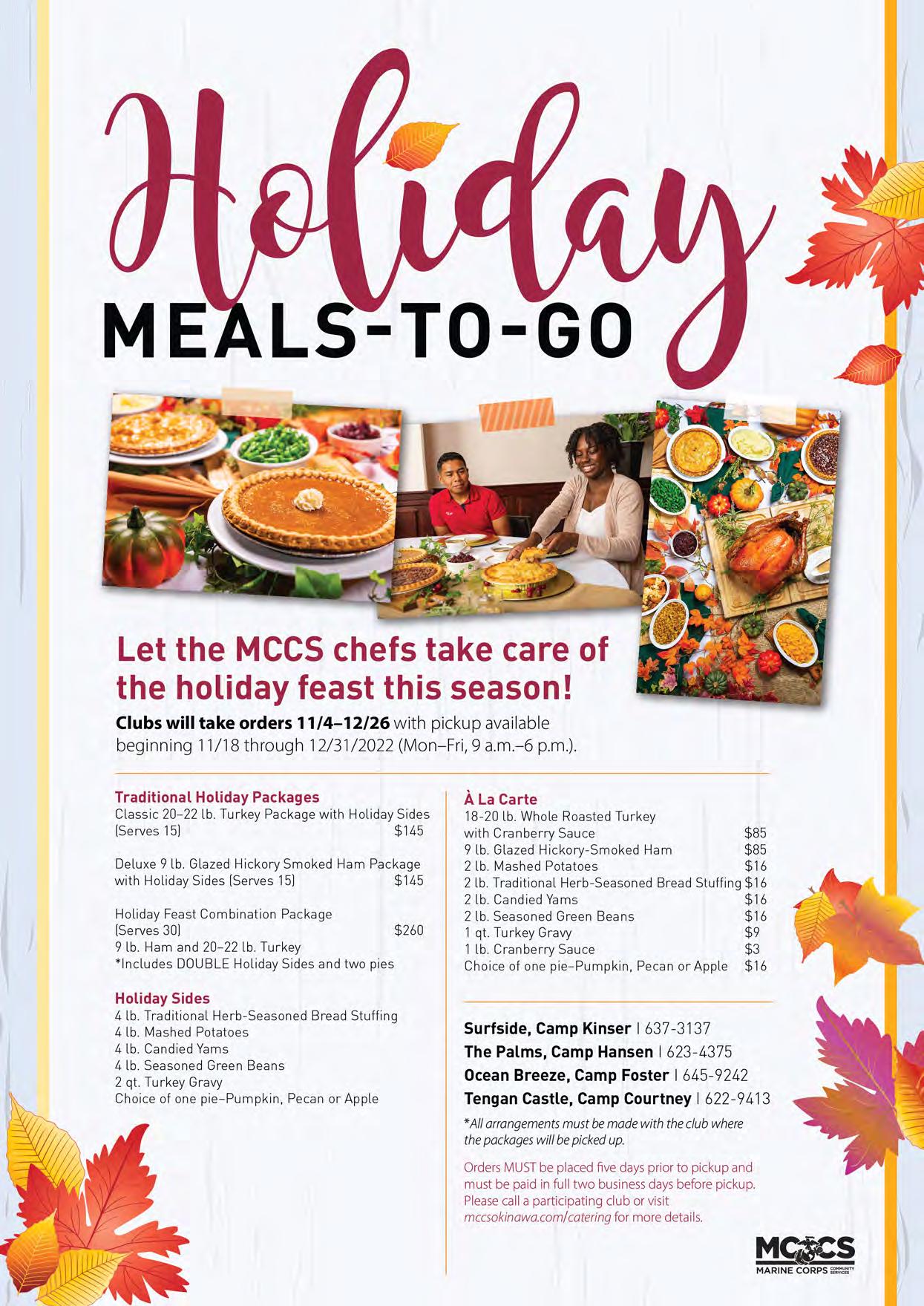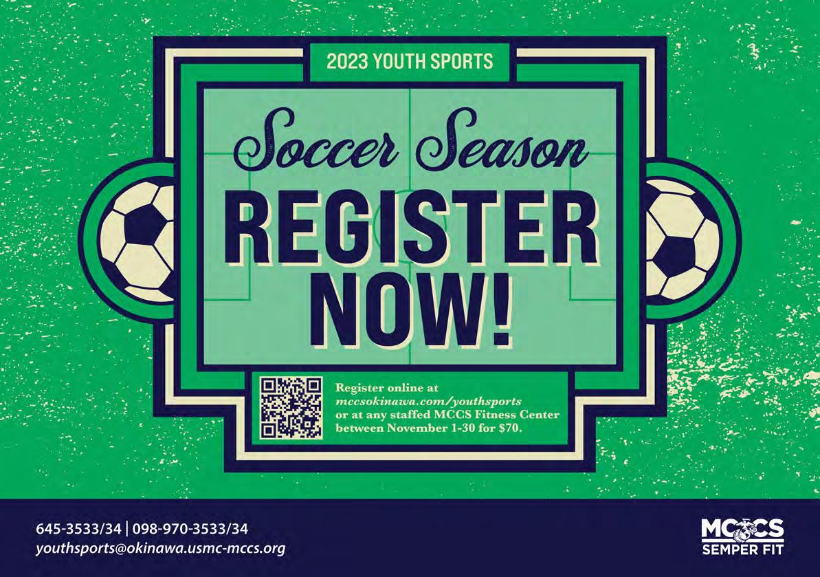 it’s only half the distance of that famous 26.2-mile run, it’s sure to be twice the fun! 31 Gobble…Gobble… …Touchdown! We recommend not stuffing yourself with Thanksgiving leftovers right before coming to this flag football tournament. 33 Black Friday Aerobathon Score those Black Friday deals online and enjoy your Thanksgiving meal guilt-free by getting your body moving at Gunners Fitness Center on Camp Foster! marines + families 35 For the Writers Connect with other community wordsmiths and get that bestseller on the page at FREE NaNoWriMo workshops. 37 Re-train Your Brain Class Become a better you at this four-week psychoeducational class taught by MCCS Behavioral Health Family Advocacy Program’s Prevention and Education Specialists. dining + entertainment 38 Holiday Meals-To-Go MCCS Clubs will make serving up a taste of home as easy as pie. Choose complete meals, à la carte selections or mix and match your favorites! 41 Thanksgiving at the Clubs Take a break from the dishes this Thanksgiving and celebrate the holiday with banquets and à la carte feasts at a local MCCS Club or Restaurant! kids + parents 45 Youth Sports Soccer Registration Contribute to your child’s development (as well as provide a fun and healthy activity) this fall by signing them up for Semper Fit Youth Sports 2023 Soccer. 47 Dinosaur Tea Party Tromp on over to the Camp Foster Library in your best Cretaceous-wear and favorite party attire for a dino-tastic time! services 49 Autumn Sales Blanketing you with savings this fall, Typhoon Motors has set up a schedule of sales as a way to say “thank you” to their customers! 51 Bundle up and Bounce! Earn the title of ‘holiday hero’ this fall by throwing a bouncy block party for your kiddos and