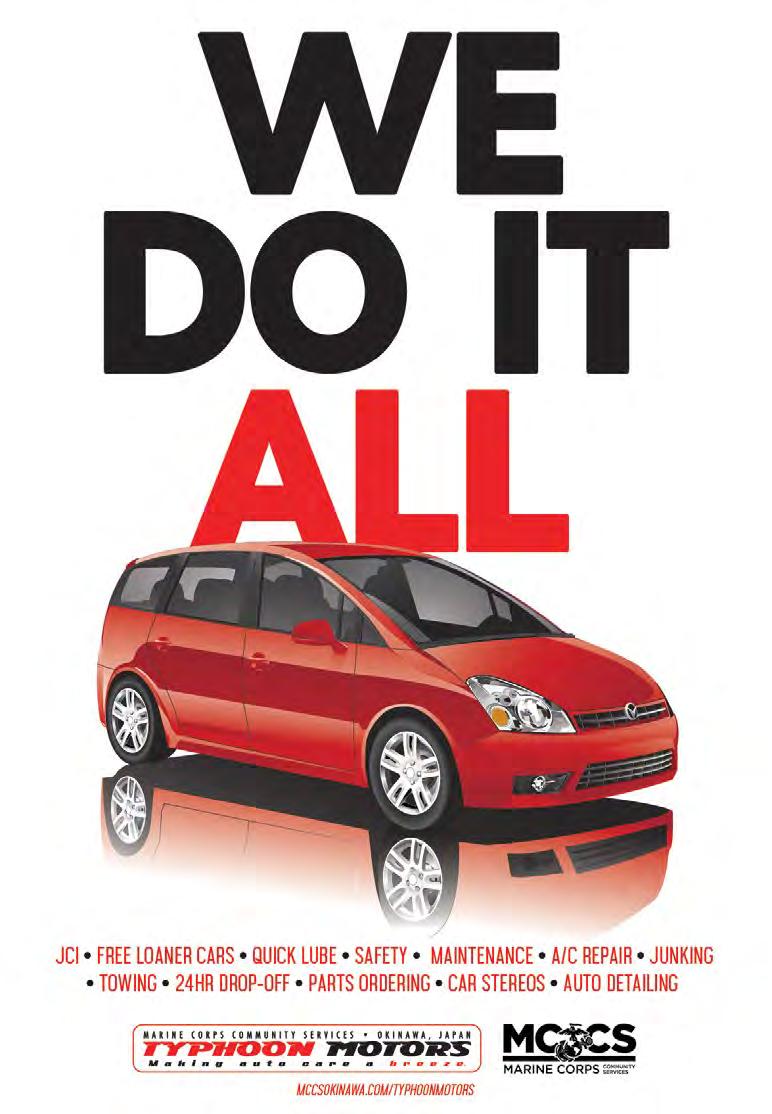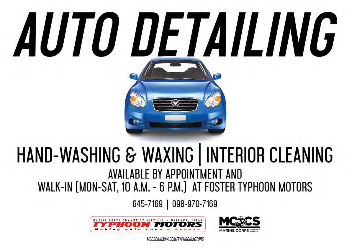 this sale and other autumn offerings, turn to p. 49. Perhaps their ride is in dire need of some loving TLC? Set them up with an Auto Detailing Service appointment at Foster Typhoon Motors! With exterior, interior and combo packages available, they’ll feel like they’re driving a brand-new car! For more information on Foster Typhoon Motors Auto Detailing services, call 645-7169. For hours of operation and phone numbers for all Typhoon Motors locations, visit them online mccokinawa.com/typhoonmotors.