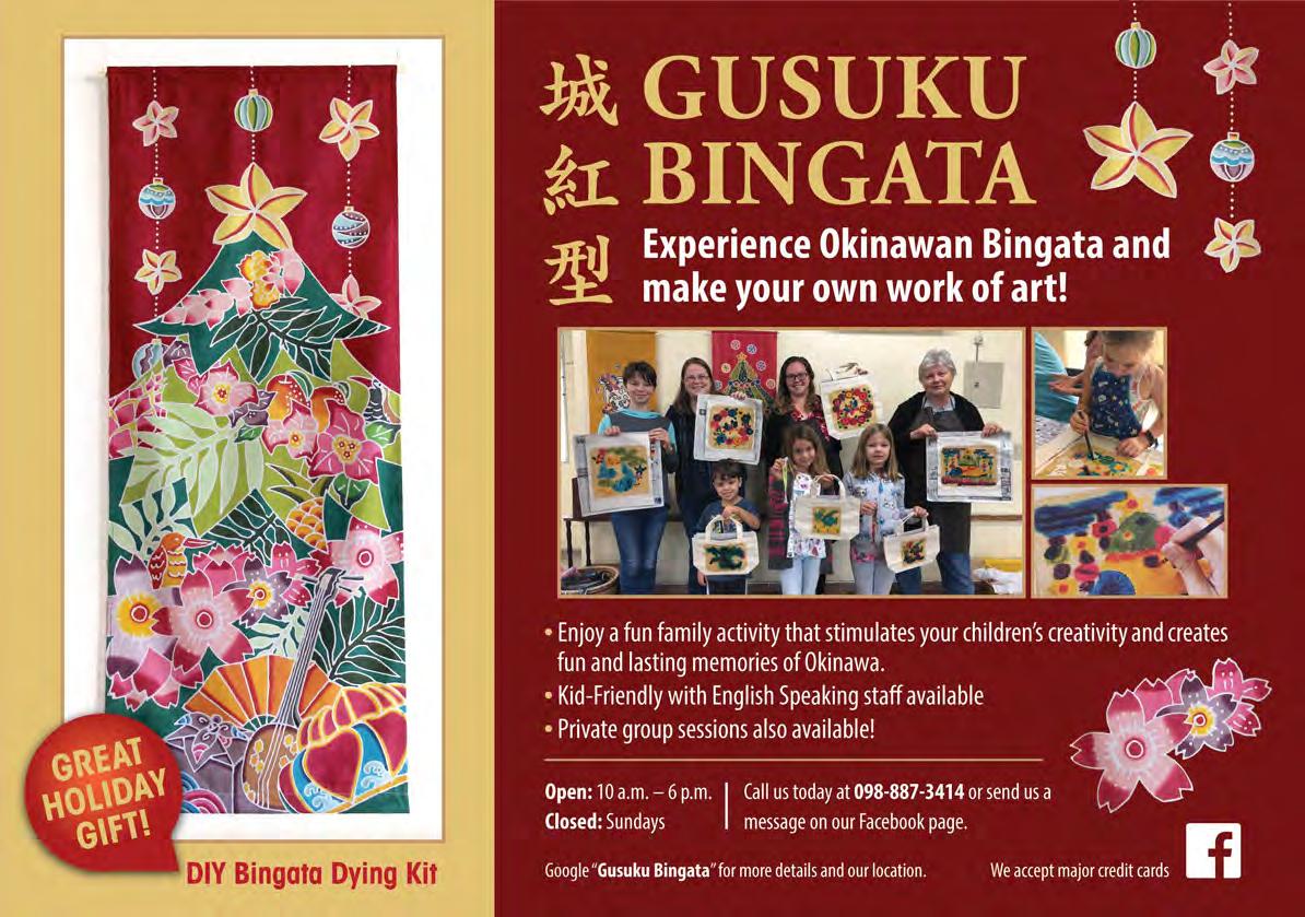 Arts & Craft Centers on Camps Foster and Courtney offer the perfect gifts for the crafty as well as craft-lovers. What could be a better present than a hand-made (by you, of course) Japanese kimekomi doll? Perhaps unleashing the creative powers of resin at their new Resin Class could provide an answer? For more information on Arts & Craft Center offerings, contact them at 622-7492 (Courtney) or 645-3674 (Foster). Visit them online at mccsokinawa. com/artsandcrafts or mccsokinawa.com/fosterartsandcrafts respectfully.
