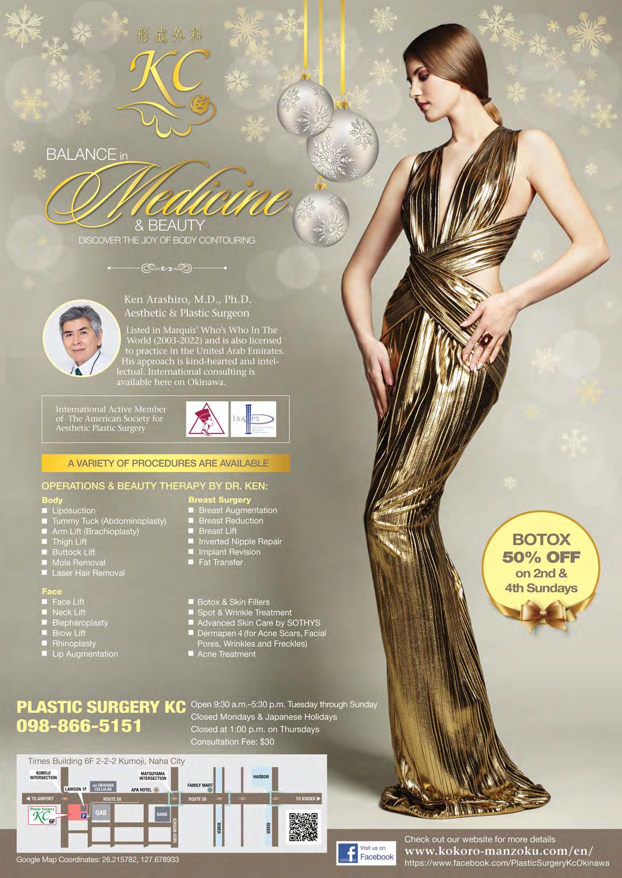 098-860-9120 ( ( )) Airport To Naha とまりん 2-2-1(3F)Maejima Naha City, 2Okinawa,Japan -2-1(3F)Maejima Okinawa,Japan 2km E-mail Open : Mon.-Sat. 10:30a.m.-6:00p.m. Wed. 10:30a.m. noon Closed : Sundays & announced days Please let us know if you are bringing any children with you. Body Care Season Laser Hair Removal All Skin Types & All Seasons ¥3,000 TATTOO REMOVAL with PicoSure, the latest tech Before After ¥8,000 Other Fillers & Botox The latest Teosyal or the original RestylaneFor wrinkles, lips, & contouringAllergan Botox & Dysport available ! After Before ★for jowls After Before ★chin ★etc. Minor saggy parts are treatable with mini-lipo Mini-LipoMini-Lipo CHEST CARE SYRINGE METHOD LIPO The safest & most e ective surgical method! ・Gynecomastia Correction ・Breast Enlargement & Lift ・Areola / Nipple Care ・etc. ※Please bring this ad with you on your rst visit. After Before After Before DEEP PLANE Facelift After Before A groundbreaking approach for full lifting with a natural e ect. BREAST ENHANCEMENT Mentor’s SMOOTH Memory Gel available! ¥40,000 Fat Transfer & Fillers available For moremoisturized skin ¥48,000After Before BREAST FAT TRANSFER Slimmer Body, Fuller Breast !! JUVEDERM still the best filler