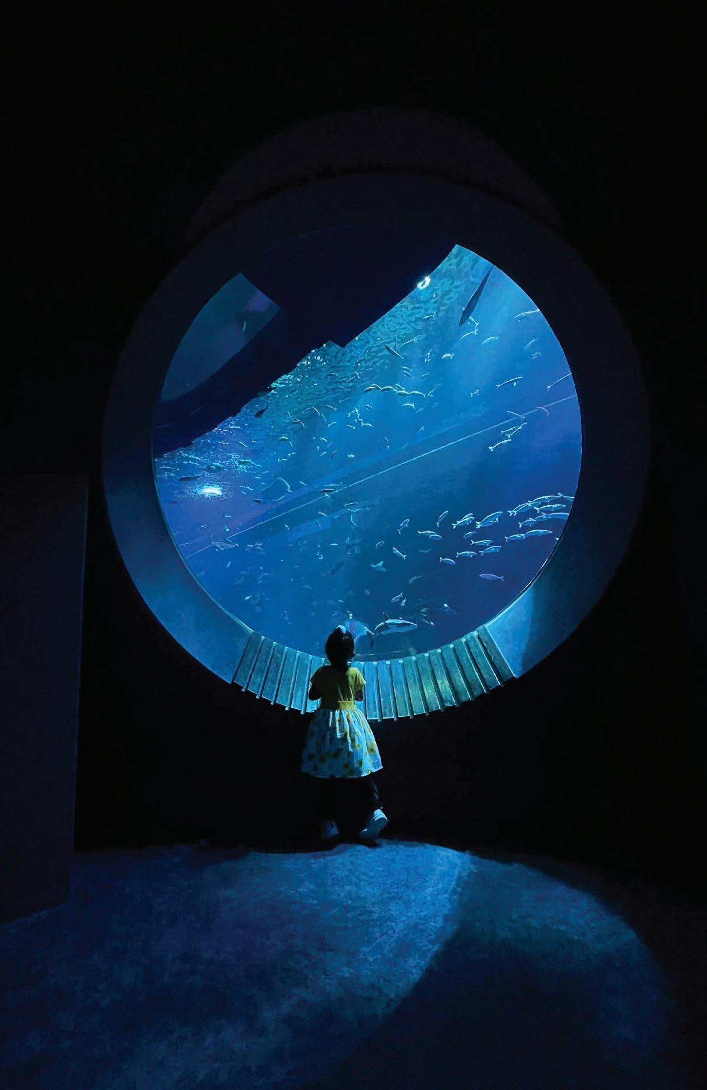 Te “main course” of DMM Kariyushi Aquarium is, of course, the largest tank in the facility, which sports a large window and smaller circular windows, ofering views of schools of Indian mackerel, rays, larger sharks, snappers, groupers and more—including a sea turtle. However, what makes this aquarium unique is the immersive virtual experience. At the “virtual aquarium” exhibit, visitors can also view realistic displays of creatures that would be impossible in an actual aquarium—including an encounter with a giant squid over 18 meters in length and living in waters at depths of over 500 meters.