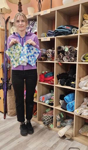 Lacey in the MCC Thrift fabric section with completed quilt blocks. (MCC Photo/Ana Galindo)