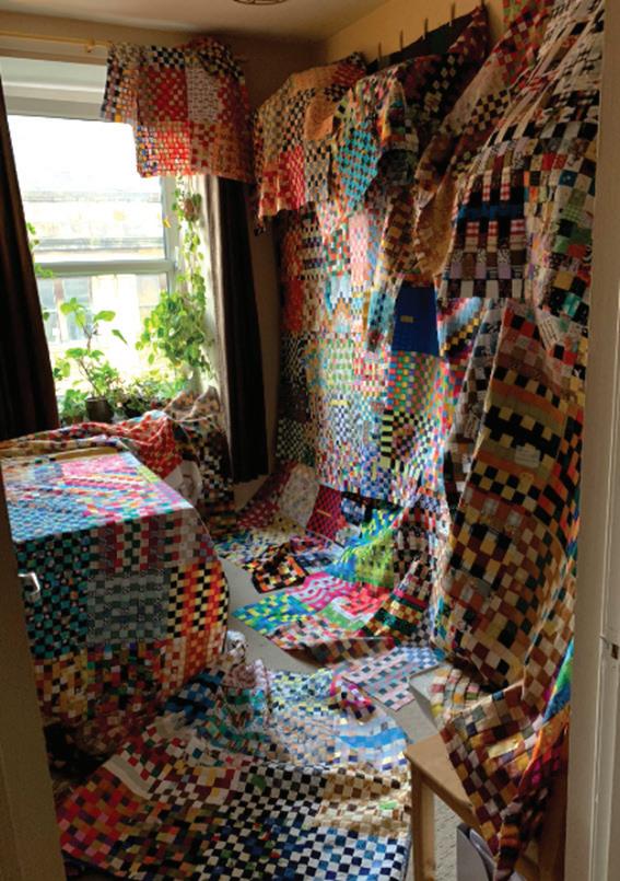 inflicted upon the people of Gaza, grassroots efforts have emerged to bear witness and envision a future of peace and justice for all in Palestine–Israel. One such initiative is a collaborative quilted memorial banner titled An Inch for Each of the Dead. According to the project site, the quilt aims to serve as a vibrant memorial and communal grieving piece, as well as an act of protest against ongoing violence. Textile artists, crafters (and everyday lovers of peace!) have been invited to contribute 10x10 inch quilt blocks made of 100 one-inch squares. Each quilt block represents and remembers 100 lives lost to this violence and persecution. Once sewn together by organizers in