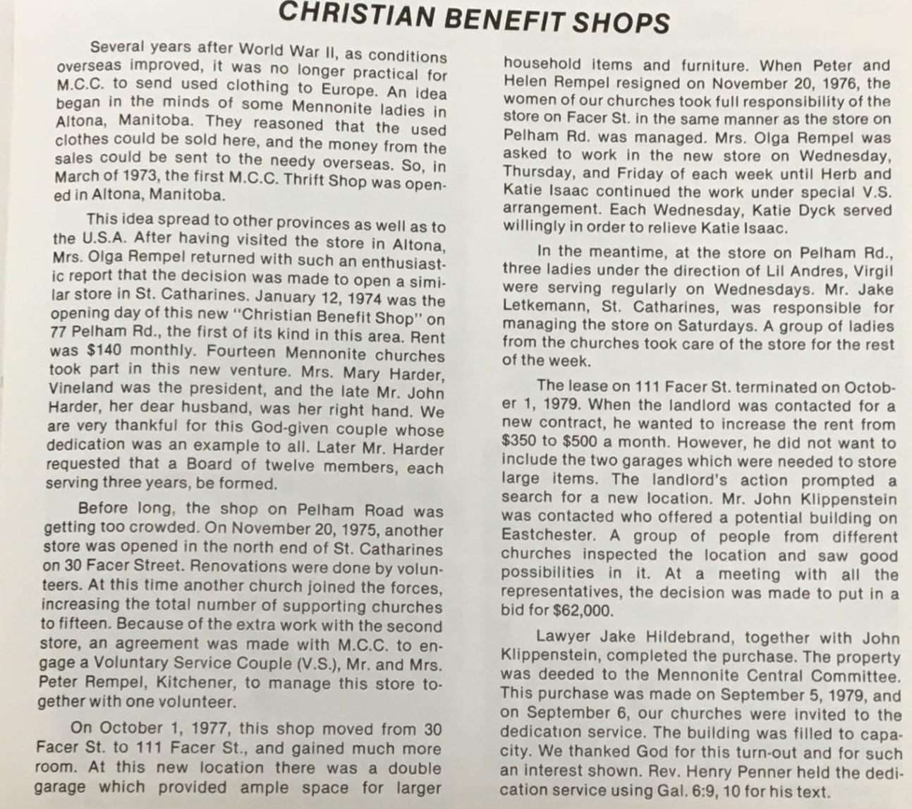 Did you know that you are part of a legacy of generosity! In 1974, a group of passionate supporters of Mennonite Central Committee (MCC) opened the first MCC Thrift Store in Ontario. Our shop, originally known as the Christian Benefit Shop, was this first store, located on Pelham St. in St. Catharines. As you will see in the historical articles included in this newsletter, the story of how our shop came to be is filled with intrigue.