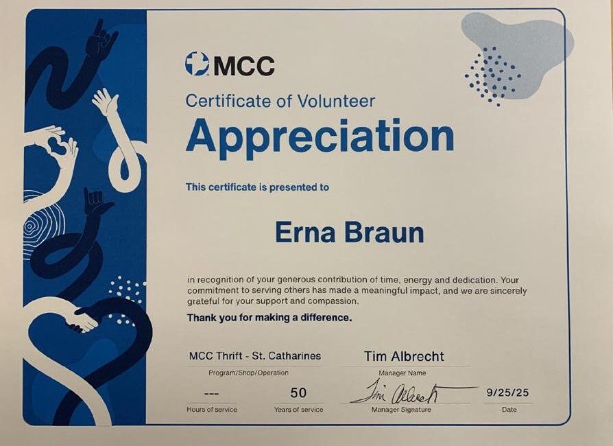 Thank you, Erna, for 50 years of volunteering with our shop. Thank you for your generous contribution of time, energy, commitment and support of MCC’s work which has resulted in meaningful impact. Thank you for making a difference.
