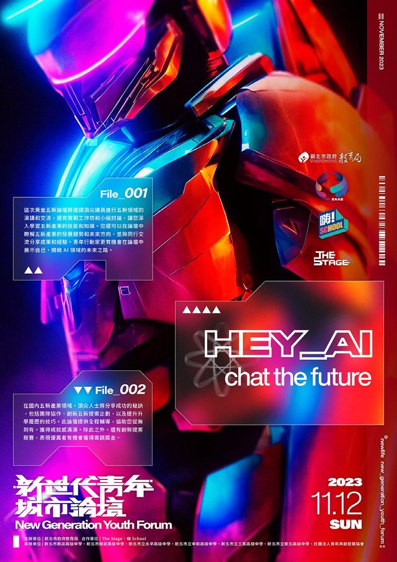 這是為大學生辦的論壇、工作坊主視覺,透過新穎、吸睛的炫酷角色,將 AI 直觀的顯現,吸引學生能夠參與到論壇當中。
