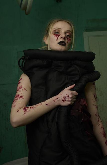 Through the construction of the garment, a straight posture with a lifted chin is inforced, to underline the loss of control the person is in, while wearing the clothes.