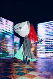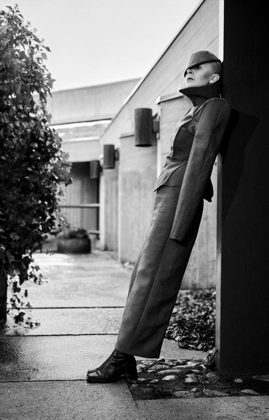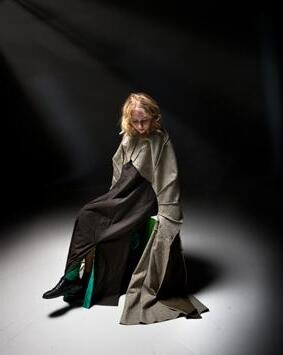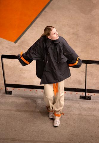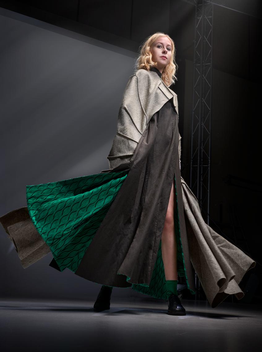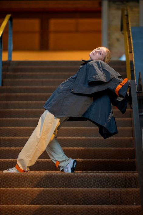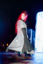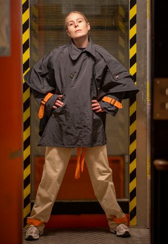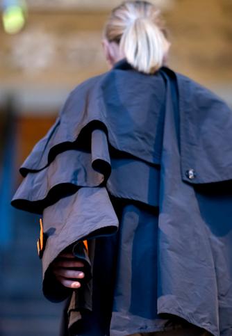 Through the designs, the subject is explored via references to the ultimate transitionary garment; the trench coat, as well as the umbrella, as a sign of change and transition.