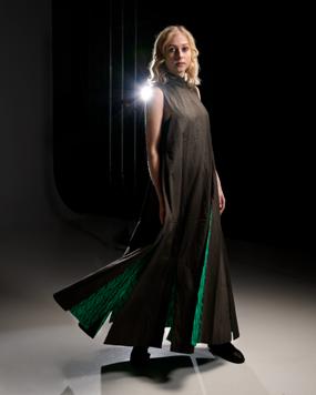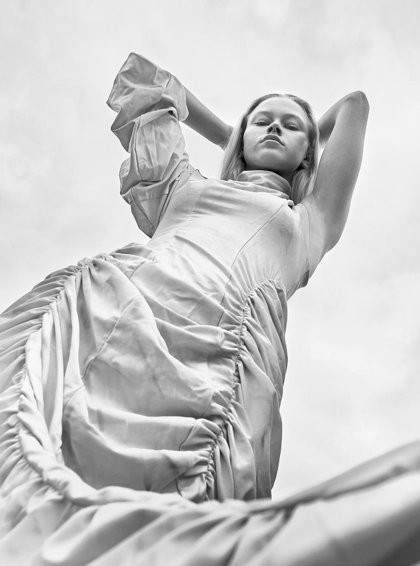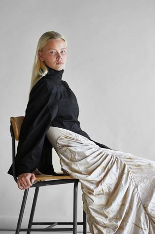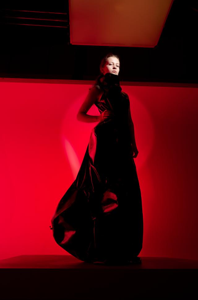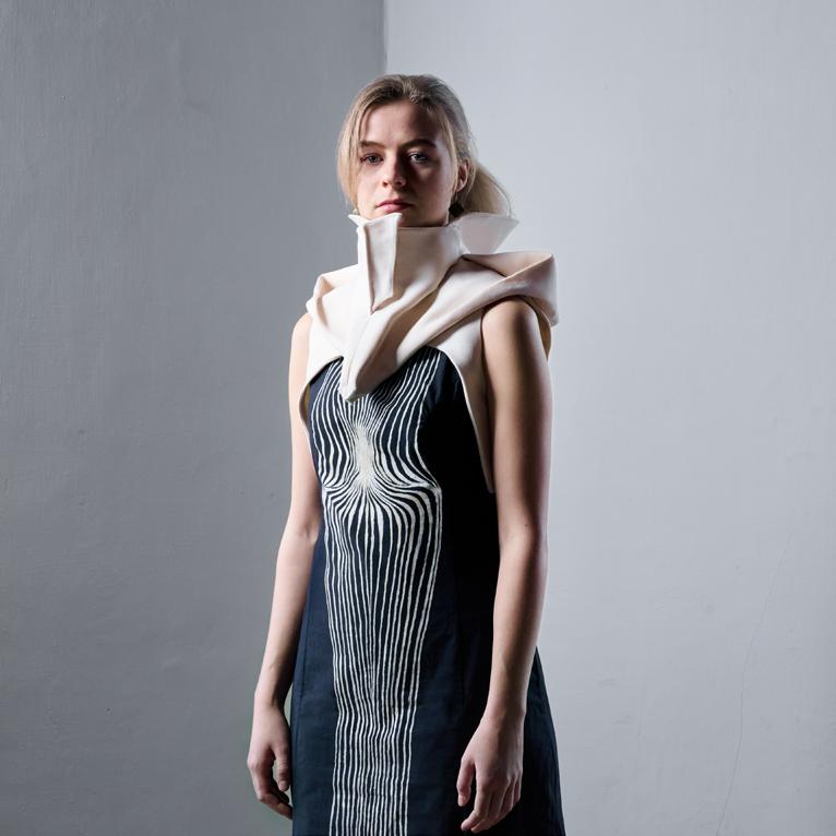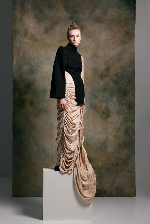 The inspiration to the project comes from the theory about how we are combined by both an identity and an I/ self. Our identity is fluid and changing in contrast to our self, which is not changing but a constant throughout our lives. Therefore, the black top part of the design is symbolising our constant self and the dress is inspired by wrinkles, representing our identity.