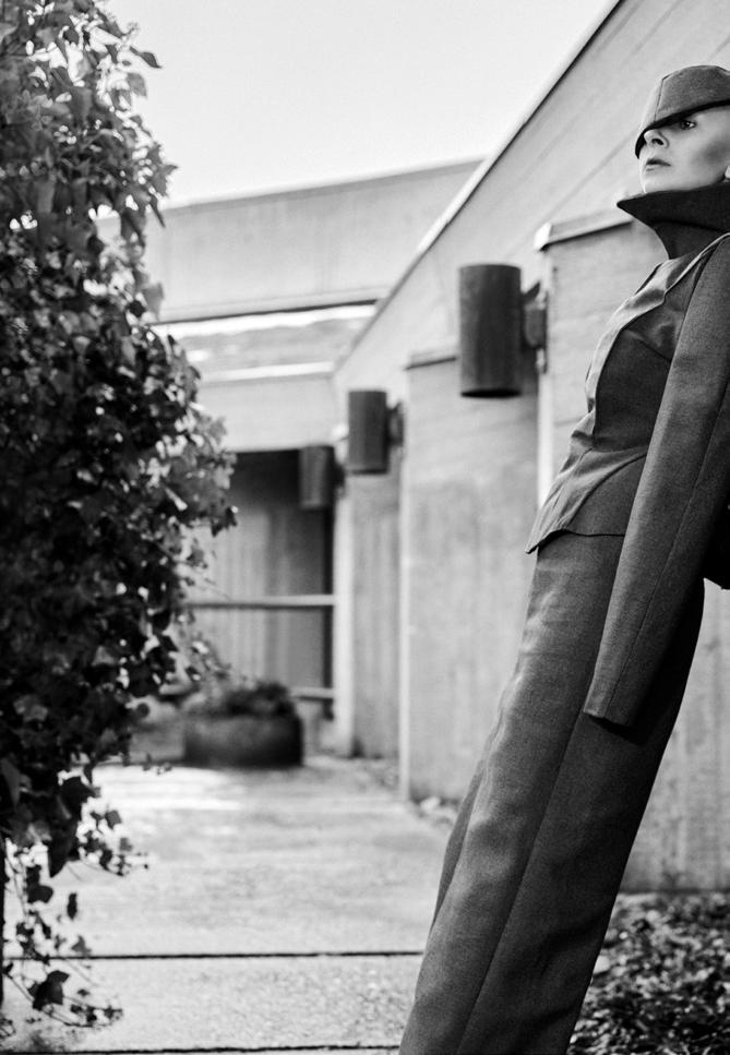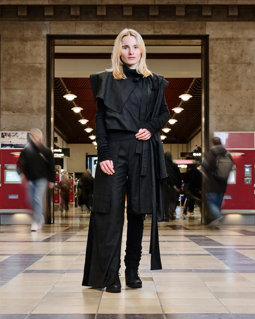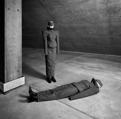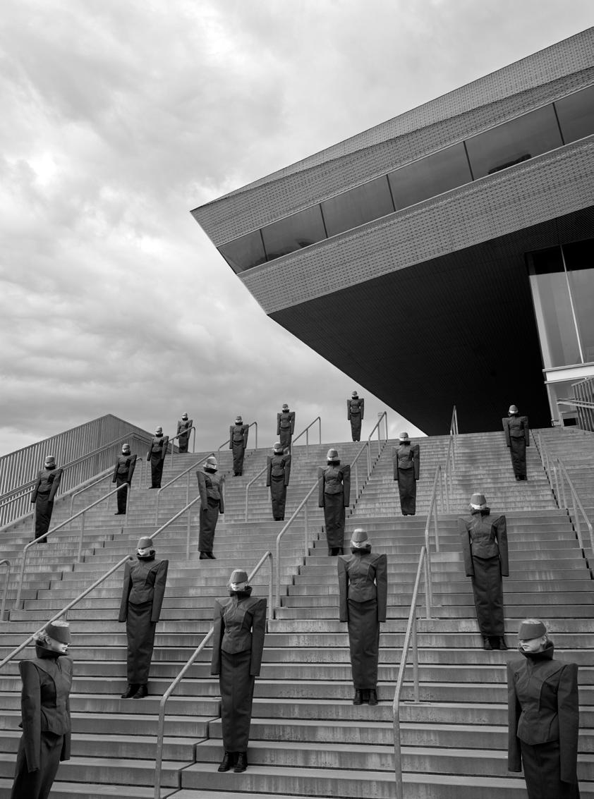 I nspired by guard uniforms, totalitarian systems, and the feeling of being trapped, the design creates a monotone and concrete setting striped by all personality and as distant from any self-control as possible.