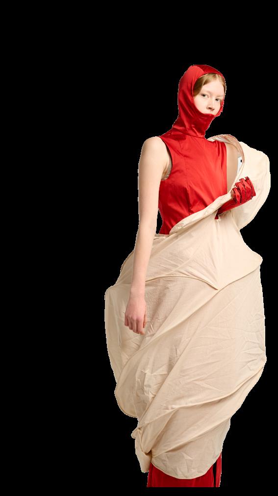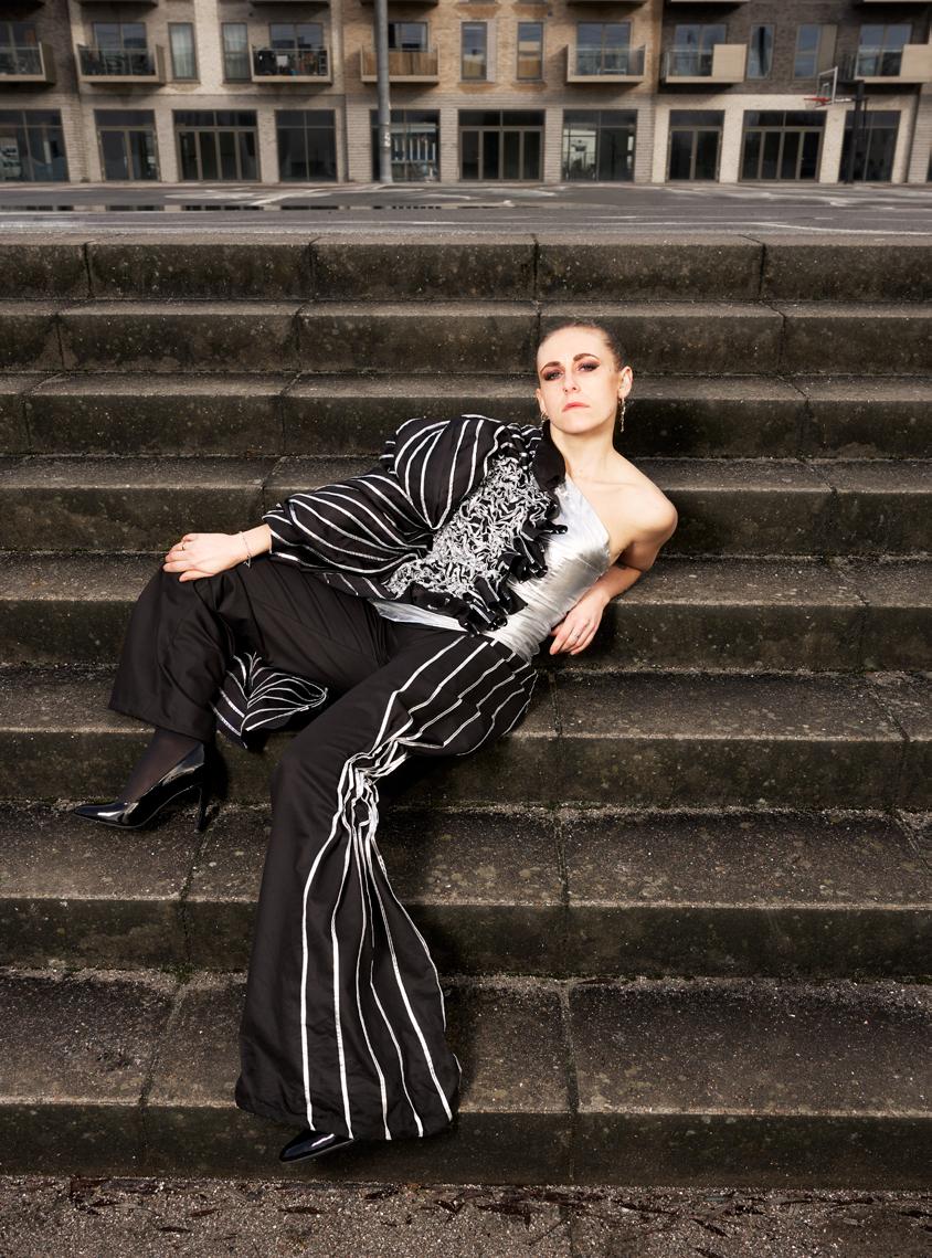 This design portrays the urge to puff yourself up as a woman in the nightlife. With her design, Sabine Olifent contributes to the ever-going conflict of women feeling unsafe walking home alone. Through this dress, she communicates the yearning to portray a false sense of self to protect the wearer of the dress.