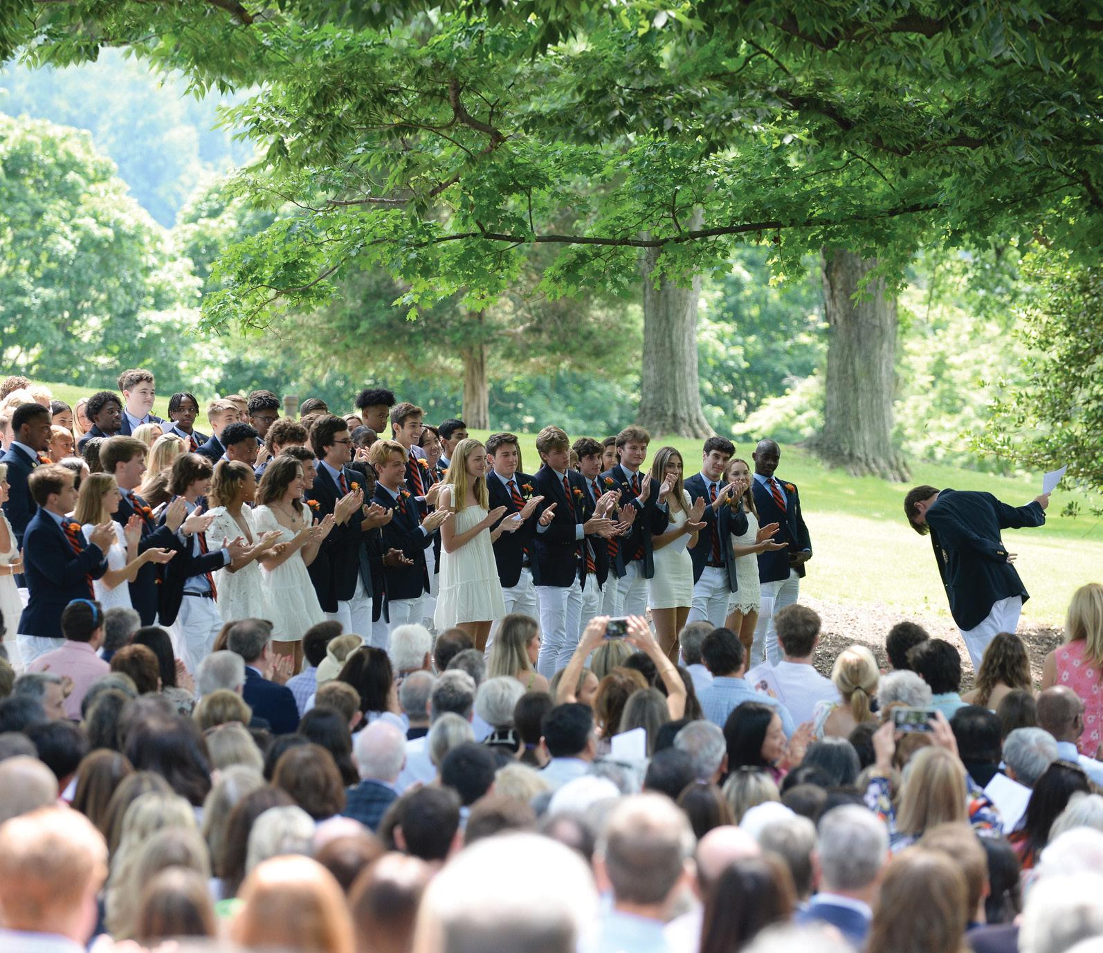 Endings and beginnings, looking back and looking ahead, and taking advantage of new opportunities were the recurring themes at the EighthGrade Closing Ceremony on June 6 on Childs Memorial Terrace. Student speaker Jolie Citron ’26 illustrated how her classmates have successfully grown and changed as they moved from building to building across campus. She then assured them that although Allan and Naylor buildings may seem intimidating, their class spirit will fill the space perfectly. Dovetailing on her remarks, Nate Winnie ’26 told the rising freshmen, “You can either see Upper School as an obligation or an opportunity.” He encouraged them to embrace the opportunities, meet new people, and gain new perspectives. “The experiences you have, the things you learn, and the people you meet will mold you into the person you become when you enter the world,” he added.