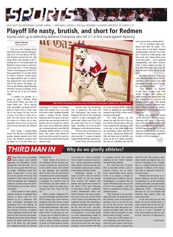 Playoff life nasty, brutish, and short for Redmen Injuries catch up to defending National Champions who fall 2-1 in first round against Nipissing Adam Sadinsky Managing Editor One year after bringing home the school’s first national championship in its 135 year history, the McGill Redmen learned that the only thing harder than winning a title is holding onto it. On Sunday night, the Redmen’s season came to a decisive end, as they lost 2-1 to the Nipissing Lakers in deciding game of the OUA East quarterfinal. To say they failed to deliver, however, would ignore the unprecedented rash of injuries that plagued the team towards the end of the season. All things considered, the Redmen played through adversity, leaving everything on the ice, but ran out of gas by Sunday night. “I couldn’t be prouder of a group of guys,” Redmen Head Coach Kelly Nobes said after the Game Three loss. “We’re playing with, essentially, our hands tied behind our back with so many guys out of our lineup. We just ran out of juice. I go back to what we’ve done over the season, but the last six weeks or so where we’ve been anywhere from seven to 11 guys out of the lineup, and that’s just unheard of.” After losing a penalty-filled Game One that saw a combined 86 penalty minutes handed out to both teams, the Redmen stormed back on home ice to tie the series in a