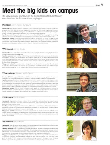 Meet the big kids on campus The Daily gives you a rundown on the five Post-Graduate Student Society executives from the Thomson House jungle gym President John Ashley Burgoyne Street cred: After collecting a handful of degrees – a BA at Harvard and two Masters – Burgoyne is now chipping away at a PhD in Music Technology. He joined the PGSS after the VP Academic resigned last November, but says his people skills will be better put to use as President, not in closed-door meetings representing the Society. So far he is on good terms with SSMU – let’s hope his skills keep it that way. Sandbox projects: Burgoyne has plans to make a “more user friendly PGSS” by revamping its web site, filling Thomson House’s social calendar, and encouraging interaction between grad students outside of labs. Playground verdict: So much for worker solidarity. Burgoyne has steered clear of the Teaching Assistant strike, and doesn’t plan to help TAs with reimbursement projects. Although he established the Graduate Students and Post-Doctorate Employment Committee, which unites TAs, work-study students, post-doc fellows, and research assistants, he has no concrete plans for what they’ll be doing this year.