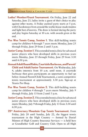 25th Anniversary Mountain Cup Tennis Tournament. From Friday, July 20 until Sunday, July 22, the biggest tennis tournament in the High Country — formed by Daniel Minton of High Country Insurance Services — is held here at Grandfather Golf and Country Club. Open to all High 18
