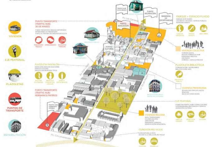 Tomando en cuenta los siguientes aspectos: Color (C): un cambio de color para las edifi caciones, con la paleta sugerida, a fin de obtener una mejor homogeneidad y evitar los altos con trastes. Nuevas edificaciones (NEA): recomenda ción de proyectos que cambien el uso del suelo; con las alturas, materiales y demás lineamientos propuestos. Evitando las copias y el opacamien to de la arquitectura existente. cuidado a la hora de la elección de los materiales, para evitar el los constantes en el contexto. Vegetación (VG): colocación de las espe cies recomendadas para cada espacio y el clima local. Infraestructura (INF): correcto uso de la in fraestructura de servicio, como el cableado sote rrado, a fin de evitar la contaminación visual. Mobiliario (MBU): adecuado a la función del espacio y el carácter de la edificación próximo a este.