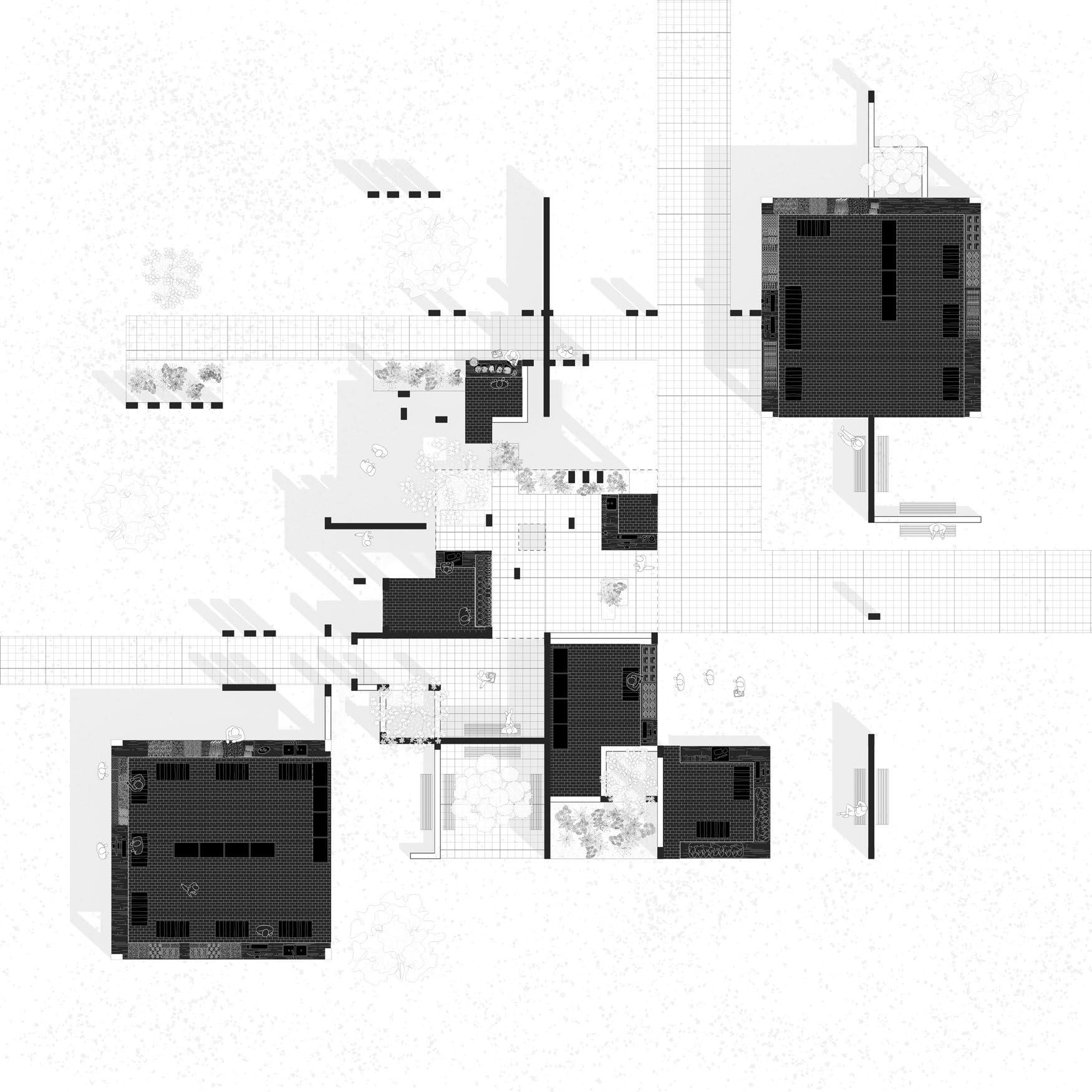 The modules are given shared space around a punctured skylight alongside three structural walls. These structural walls act as the building’s organizing elements. Program is attached to these walls, altering their perceived thickness and creating inhabitable poche.