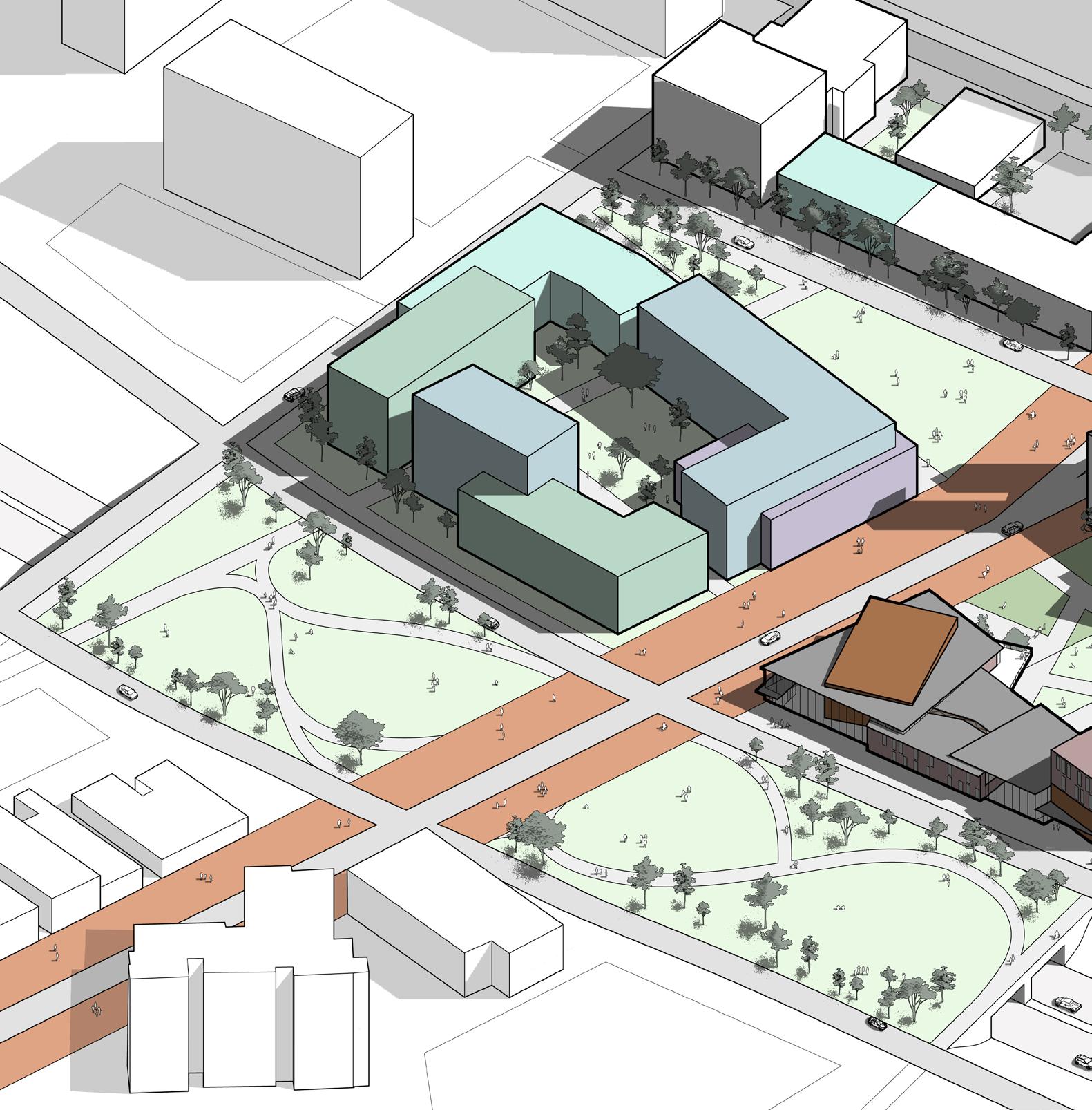 A variety of iterations were created, each exploring a different variation of the relationship between school space and public space. The final iteration uses distinct bars of programming to reach out towards the road.