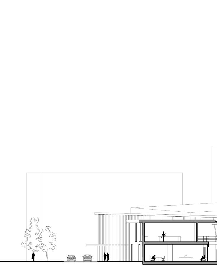 The Cultural Center is organized as one continuous space that is bookended by a theater at one end and the artist studios and galleries at the other. Between the two volumes are classrooms and other spaces for interaction and connection between people of different backgrounds and cultures.