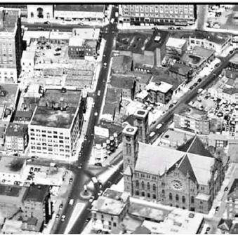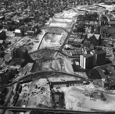 Cathedral Square was once a vibrant and lively neighborhood that was an integral part of downtown Providence. The area acted as a bustling civic center for the city, and the streets were lined with many shops and businesses. In the 1960s the neighborhood was razed to construct I-95, carving through a once dynamic and culturally important area. The city remains divided to this day.