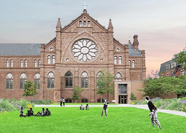 The massing of the Cultural Center is in dialogue with the Cathedral, creating a lively public space in the void between the two. The rose window of the Cathedral folds down onto the ground in the form of a lawn for public use. The lawn is surrounded by gardens of native plantings and sculptural exhibitions.