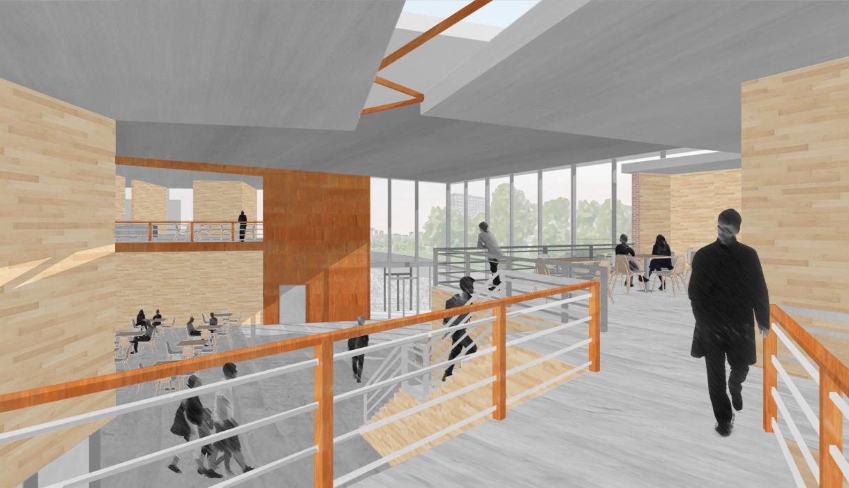 The plan is organized as an abstraction of the idea of restitching. The classroom volumes are connected on the upper floor by dynamic walkways. The upper floor peers down into the main space of the Cultural Center, creating a visual connection and fostering collaboration.