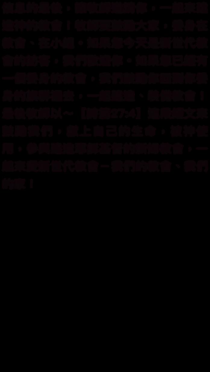 信息的最後,讓牧師邀請你,一起來建 造神的教會!牧師要鼓勵大家,委身在 教會、在小組。如果您今天是新世代教 會的訪客,我們歡迎你。如果您已經有 一個委身的教會,我們鼓勵你回到你委 身的族群裡去,一起建造、裝備教會! 最後牧師以~ 【詩篇27:4】 這段經文來 鼓勵我們,獻上自己的生命,被神使 用,參與建造耶穌基督的新婦教會,一 起來愛新世代教會-我們的教會、我們 的家!
