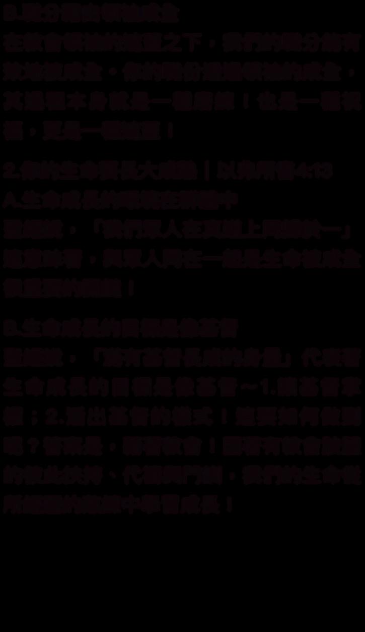 生命成長的目標是像基督〜1.讓基督掌 權;2.活出基督的樣式!這要如何做到 呢?答案是,藉著教會!因著有教會肢體 的彼此扶持、代禱與門訓,我們的生命從 所經歷的熬練中學習成長!