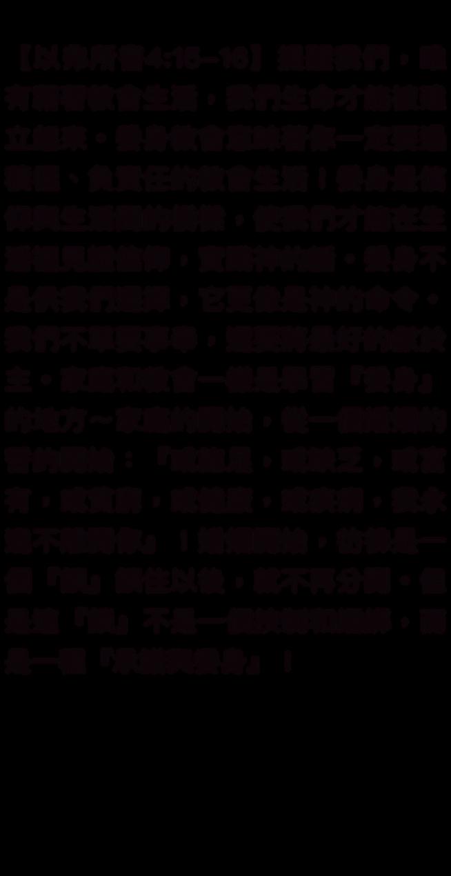 【以弗所書4:15-16】 提醒我們,唯 有藉著教會生活,我們生命才能被建 立起來。委身教會意味著你一定要過 積極、負責任的教會生活! 委身是信 仰與生活間的橋樑,使我們才能在生 活裡見證信仰,實踐神的話。