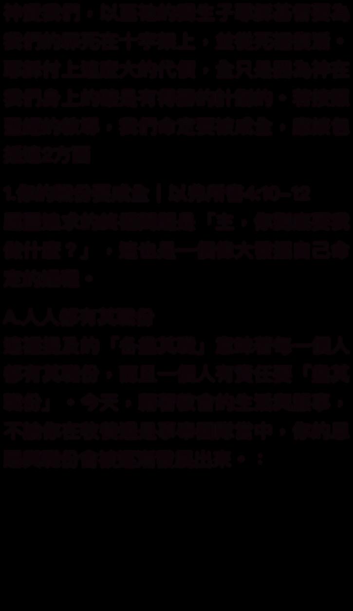 這裡提及的「各盡其職」意味著每一個人 都有其職份,而且一個人有責任要「盡其 職份」。今天,藉著教會的生活與服事, 不論你在牧養還是事奉團隊當中,你的恩 賜與職份會被逐漸發展出來。: