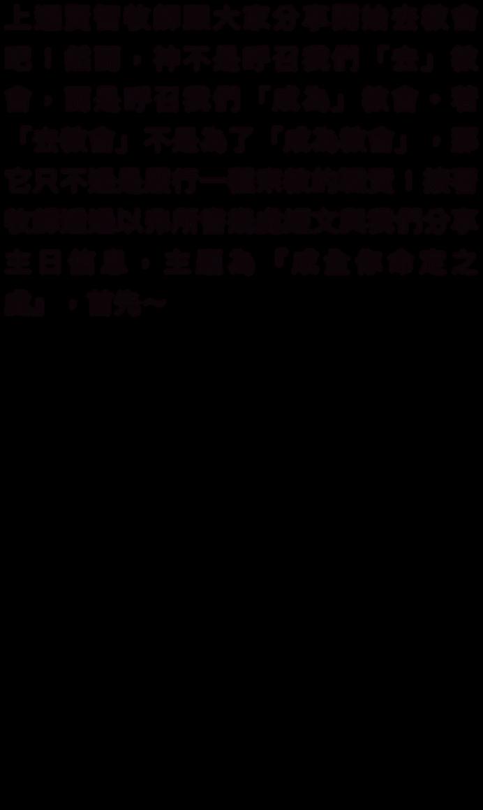 上週賢智牧師跟大家分享開始去教會 吧!然而,神不是呼召我們「去」教 會,而是呼召我們「成為」教會。若 「去教會」不是為了「成為教會」,那 它只不過是履行一種宗教的職責!接著 牧師透過以弗所書幾處經文與我們分享 主日信息,主題為『成全你命定之 處』,首先~ 前 言