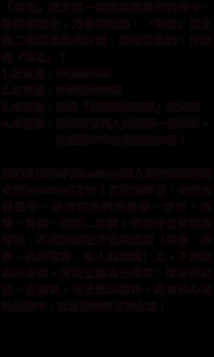「 命定」原文第一個意思就是神的命令、 吩咐和指示,乃是神說話。「命定」原文 第二個意思就是計劃、藍圖和目的。 什麼 是『命定』?