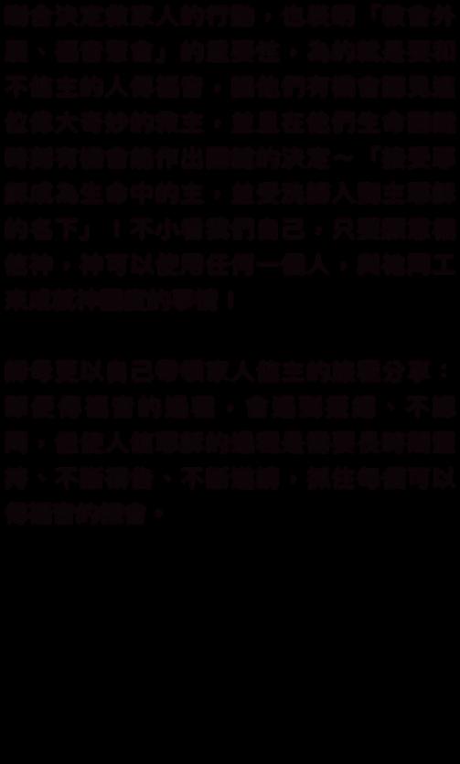 師母更以自己帶領家人信主的旅程分享: 即便傳福音的過程,會遇到拒絕、不認 同,但使人信耶穌的過程是需要長時間堅 持、不斷禱告、不斷邀請,抓住每個可以 傳福音的機會。 一、女人說/女人做 (v9-13、16、21 / v15)
